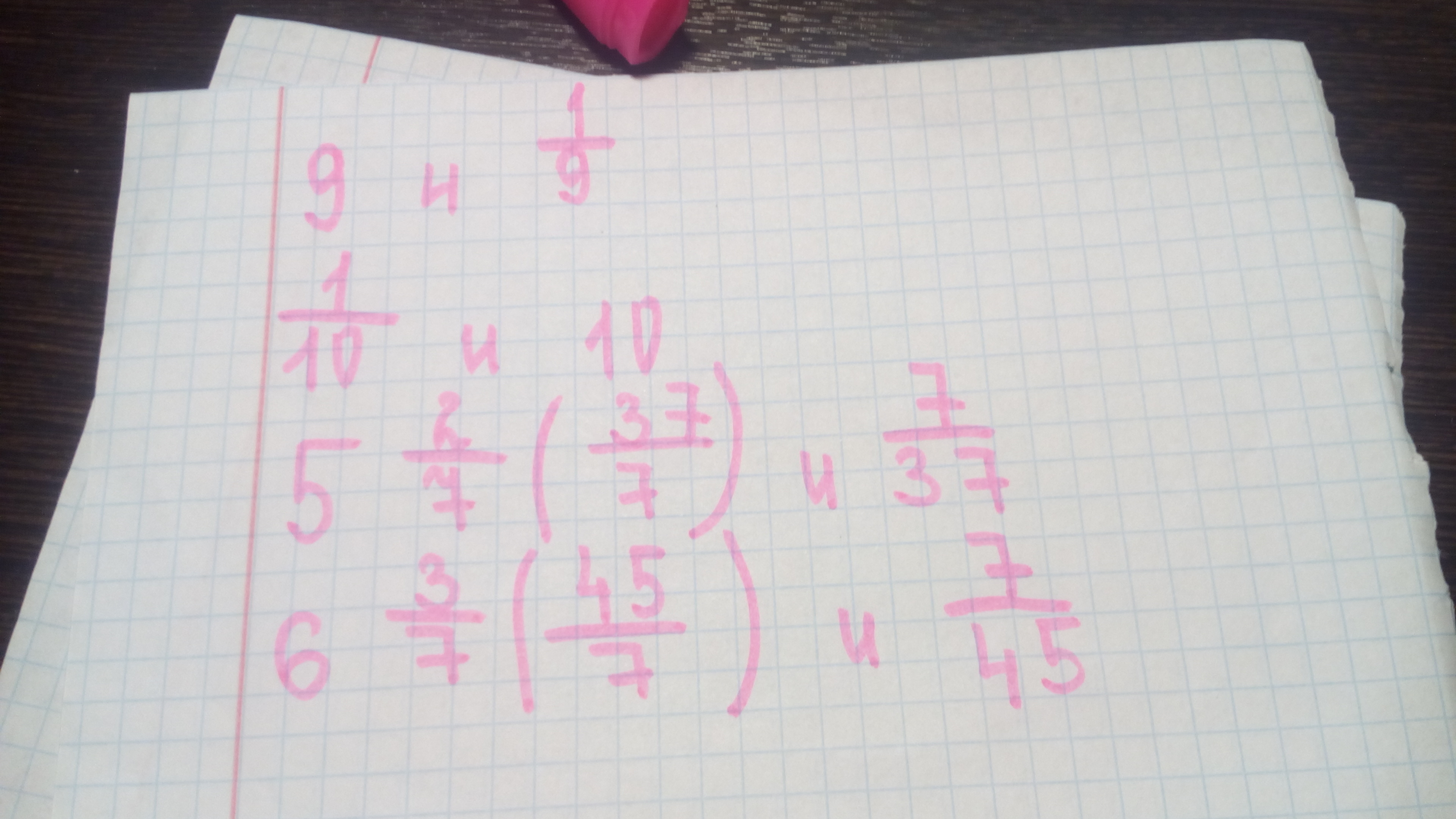 Выпишите пары взаимно обратных чисел 9 целых 1/9 , 7 /7 и 1 , 5/6 и 6/7 , 1 /10 и 10, 5 2 /7 и 7 /37 , 4 2 /3 и 5 /14 ,10 1 /3 и 31 /31 , 6 3 /7 и 7 /45