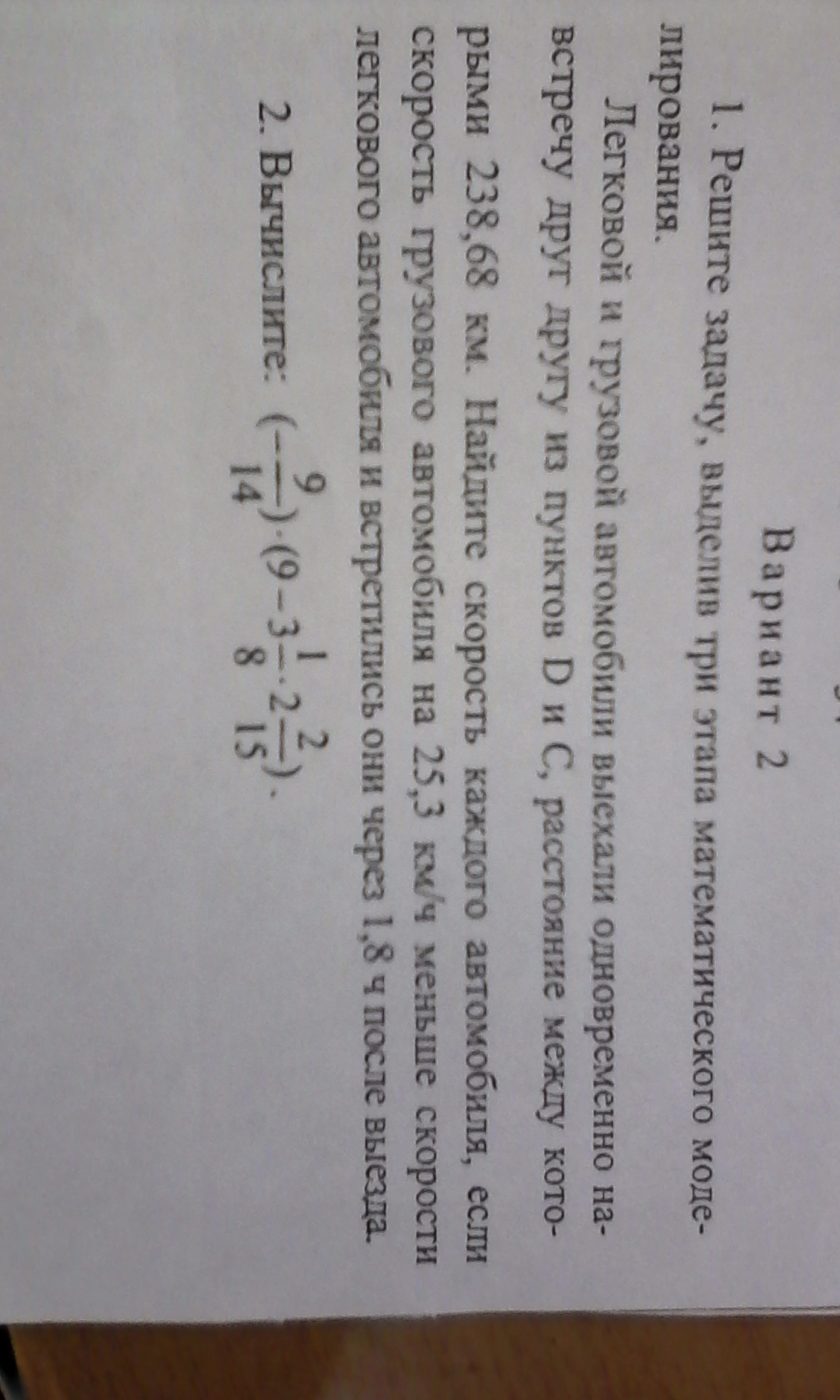 1. Скорость легкового x км/ч, грузового x-25,3 км/ч. Скорость сближения x+x-25,3 = 2x-25,3 км/ч. Встретятся через 1,8 ч, то есть