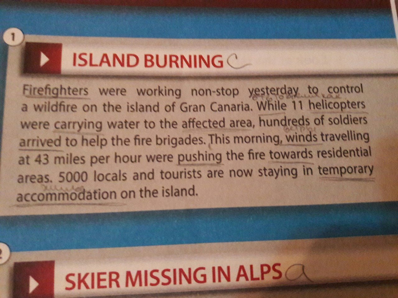 Пожарные работали вчера, они контролировали лесной пожар на острове Гран-Канария. В то время как 11 вертолётов несли воду в пострадавший район, сотни солдат прибыли чтобы помочь пожарным этим утром.