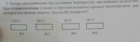 Четыре металлических бруска имеют температуру как показано на рисунке при соприкосновении С каким из брусков возникает процесс теплопередачи при котором внутренняя энергия бруска номер 2 возрастет???