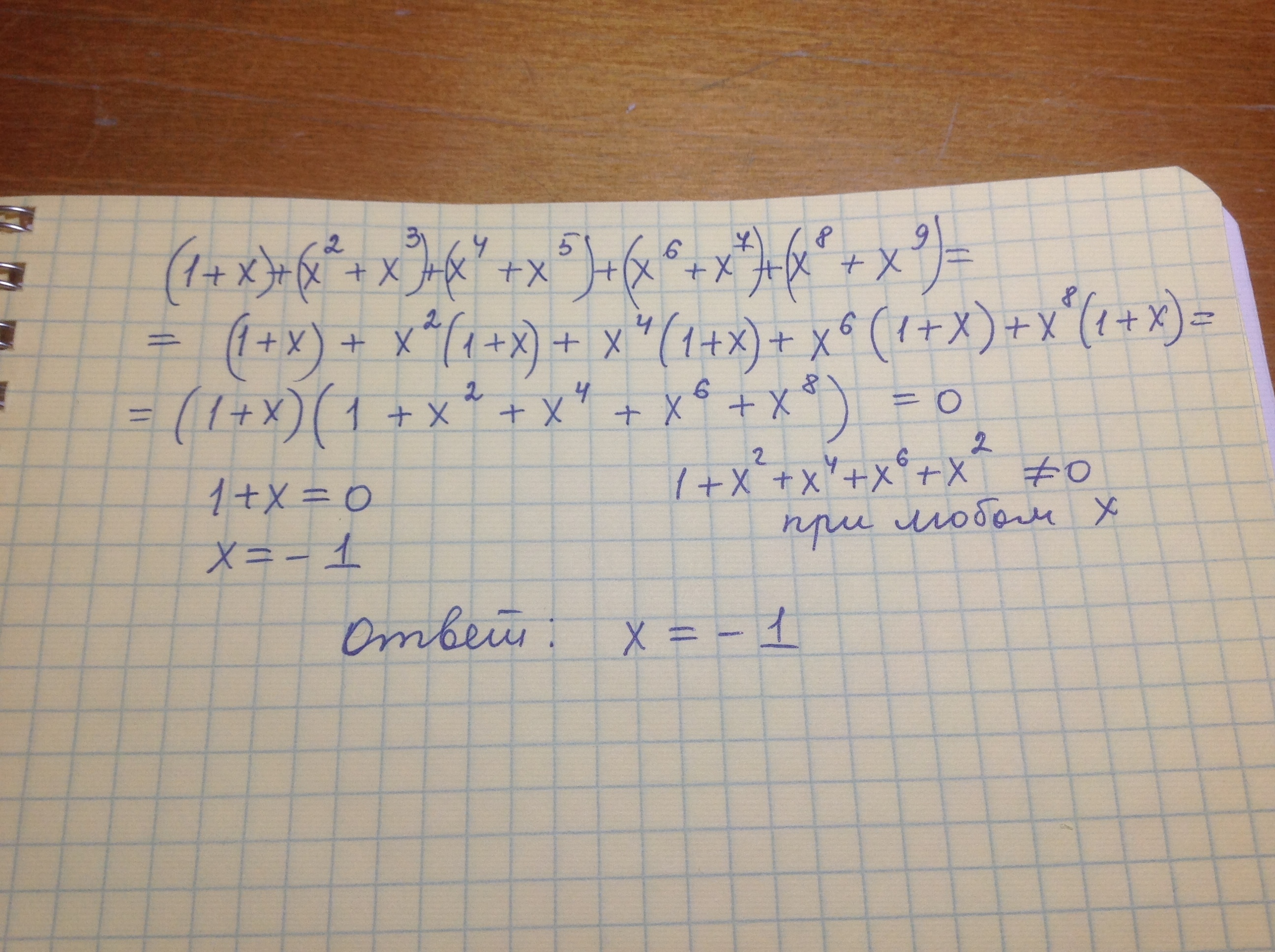 уравнение:1+х^2+х^3+х^4+х^5+х^6+х^7+х^8 + х^9 = 0