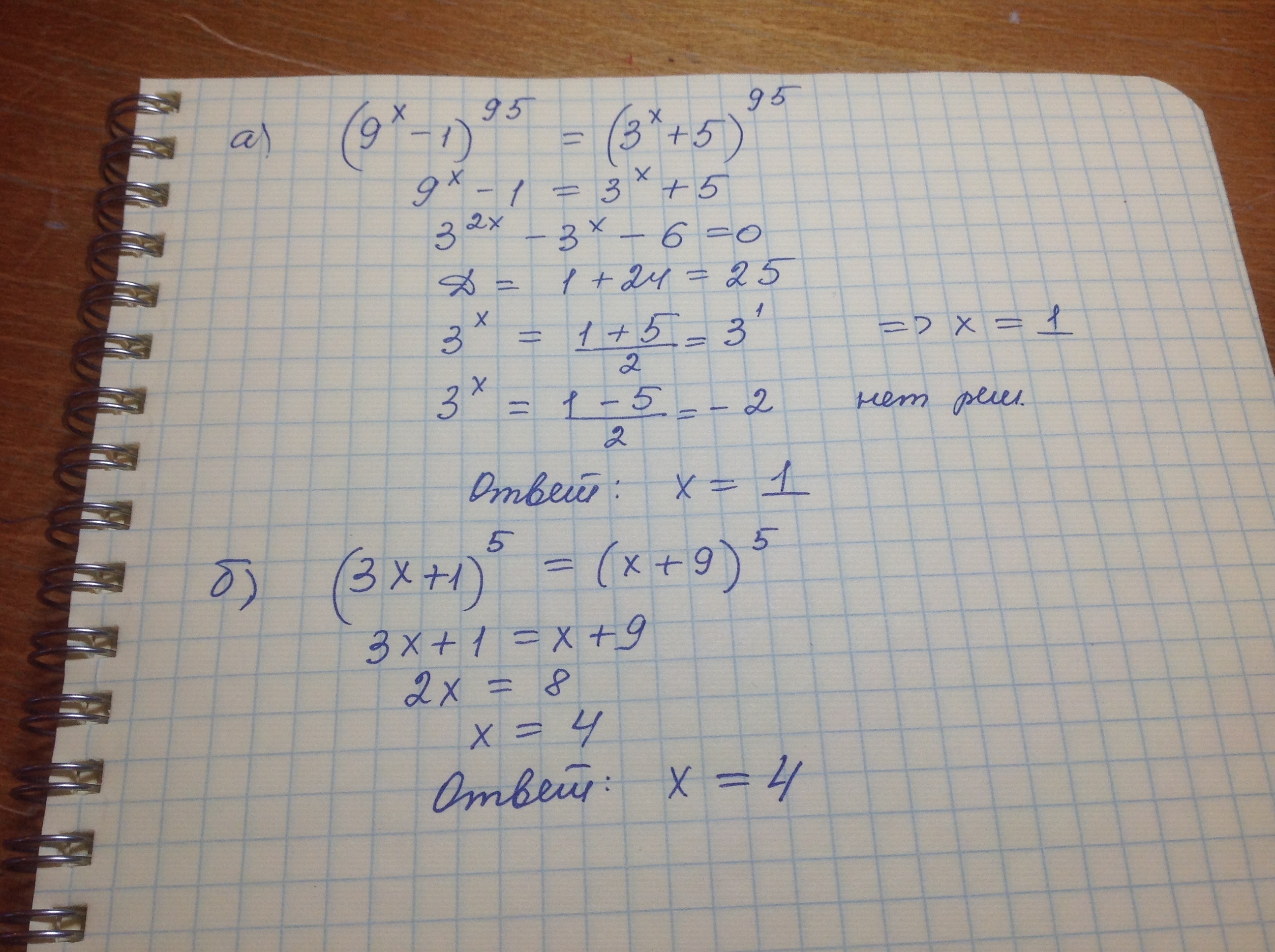 а) (9^x-1)^95=(3^x+5)^95