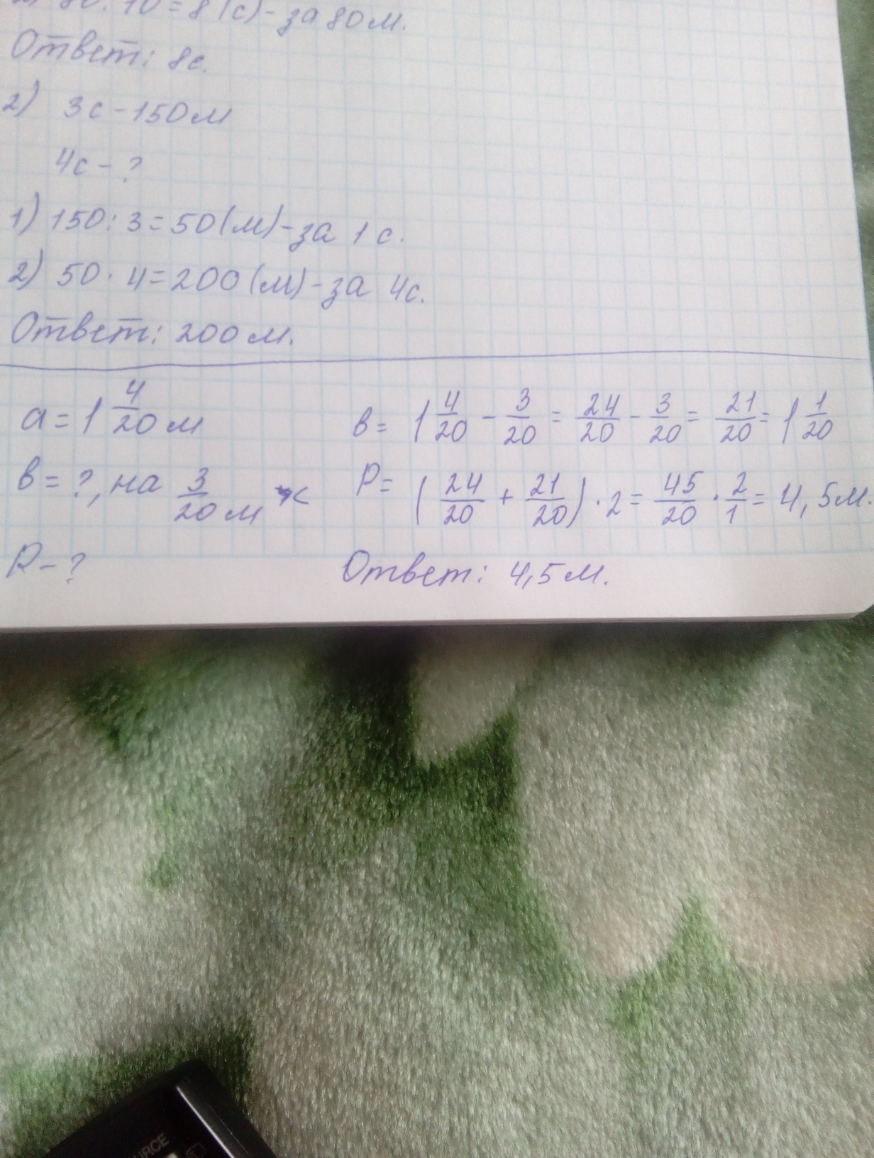Длина прямоугольника Одна целая четыре двадцатых метра а ширина на три двадцатых метров меньше длины найдите периметр прямоугольника помогите срочно пж