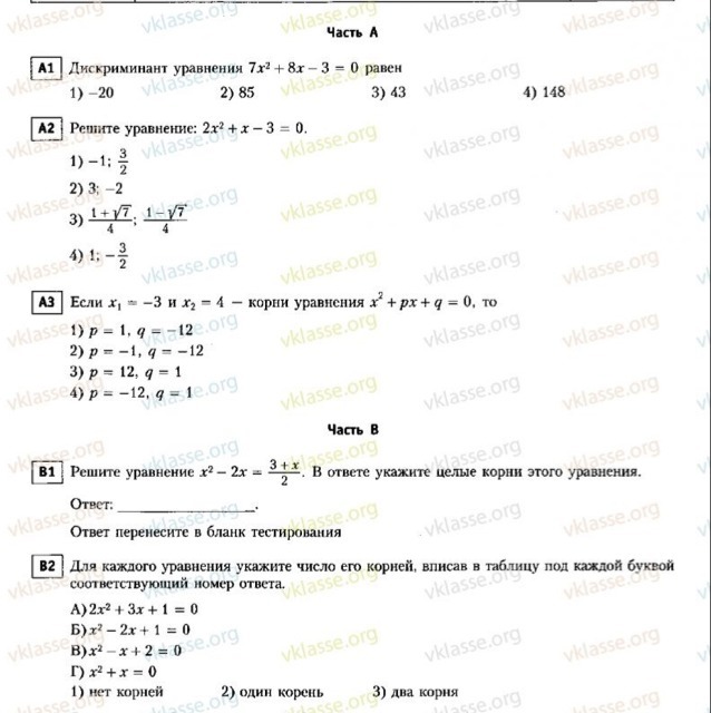 В) x²-x+2=0, D = 1-4*2 = -7 <0 - нет корней
