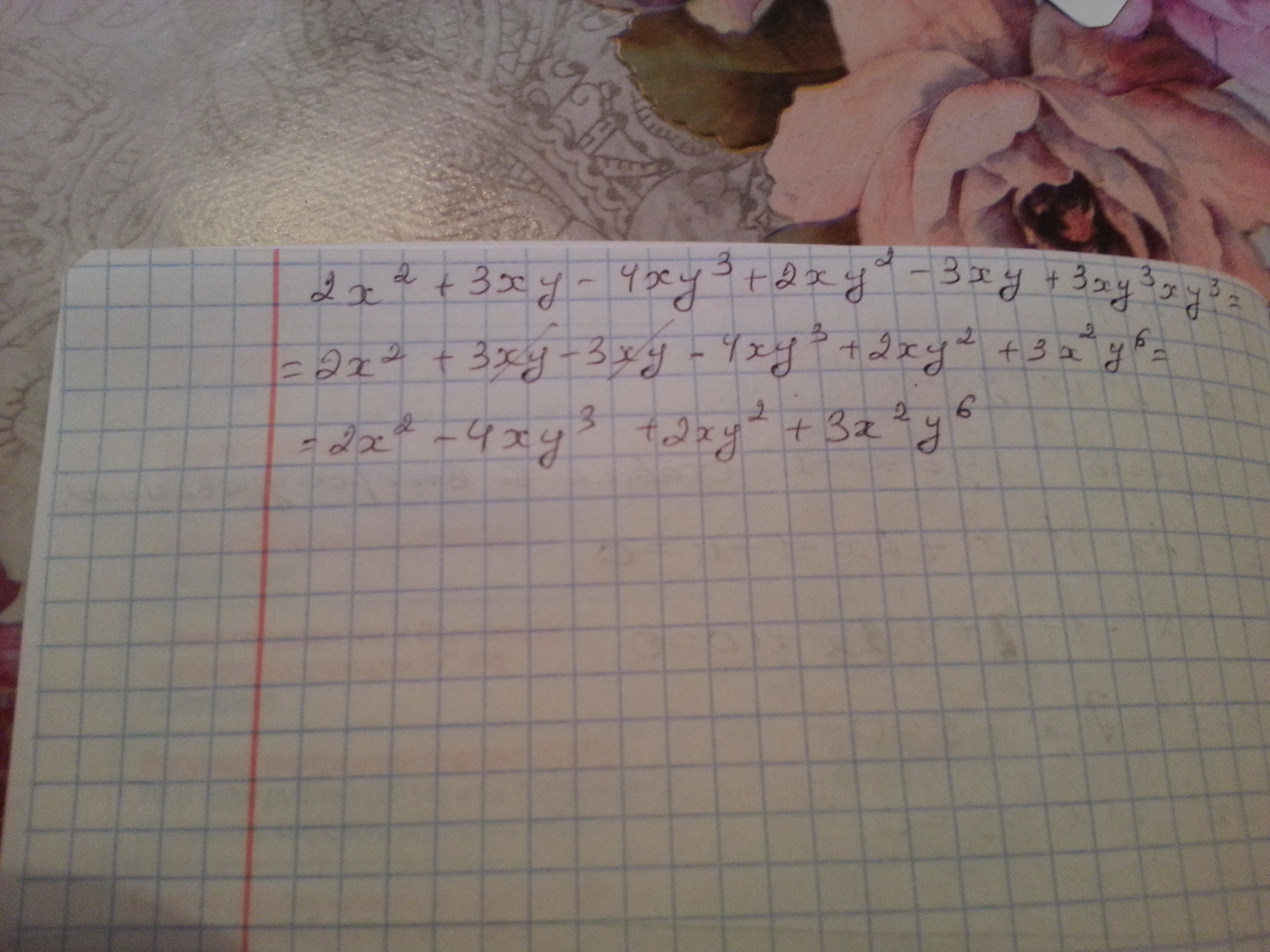Упростите выражение 2х^2 + 3ху - 4ху^3 + 2ху^2 - 3ху + 3ху^3ху^3