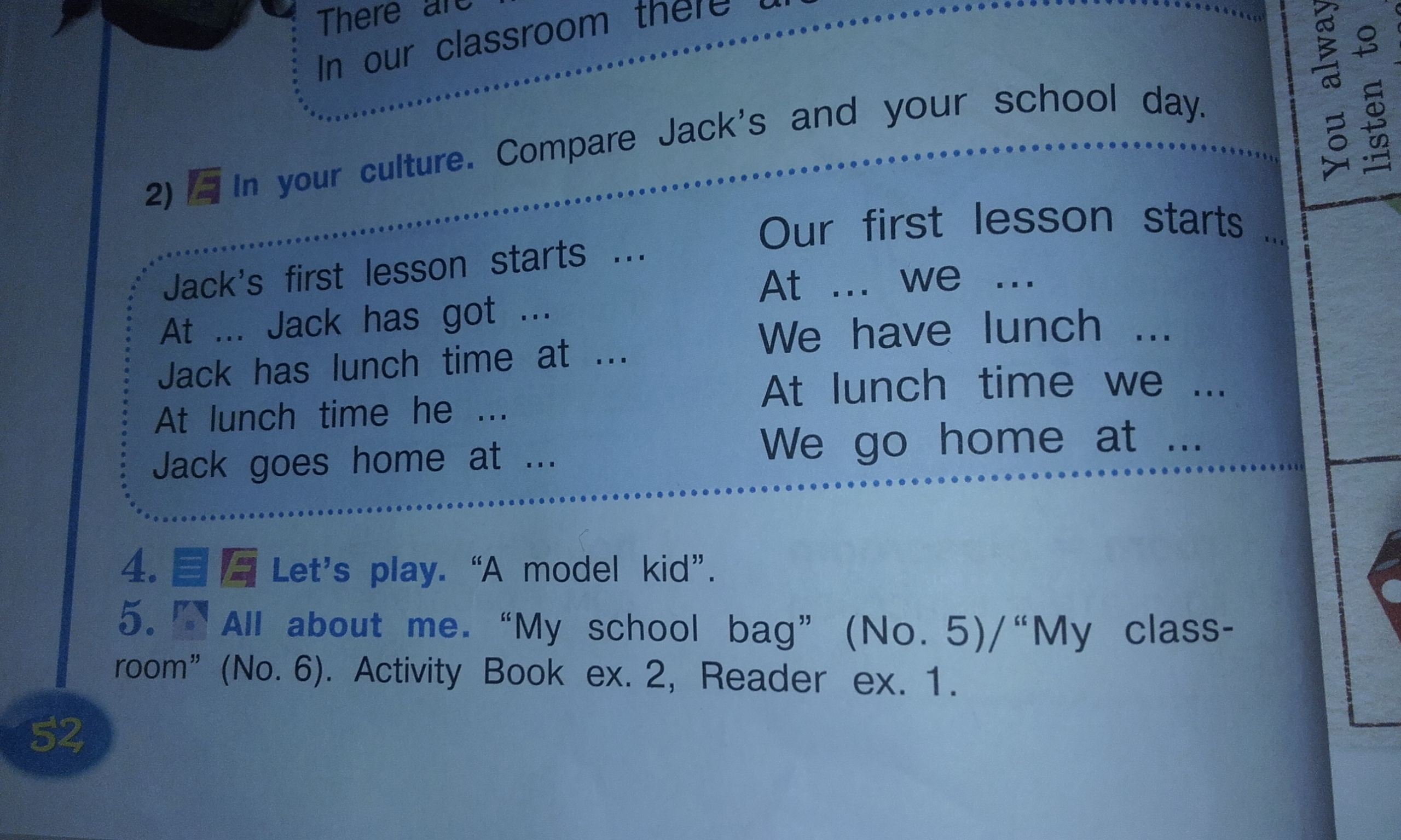 В этом упражнении нужно написать про школу Джека и про твой школьный день.