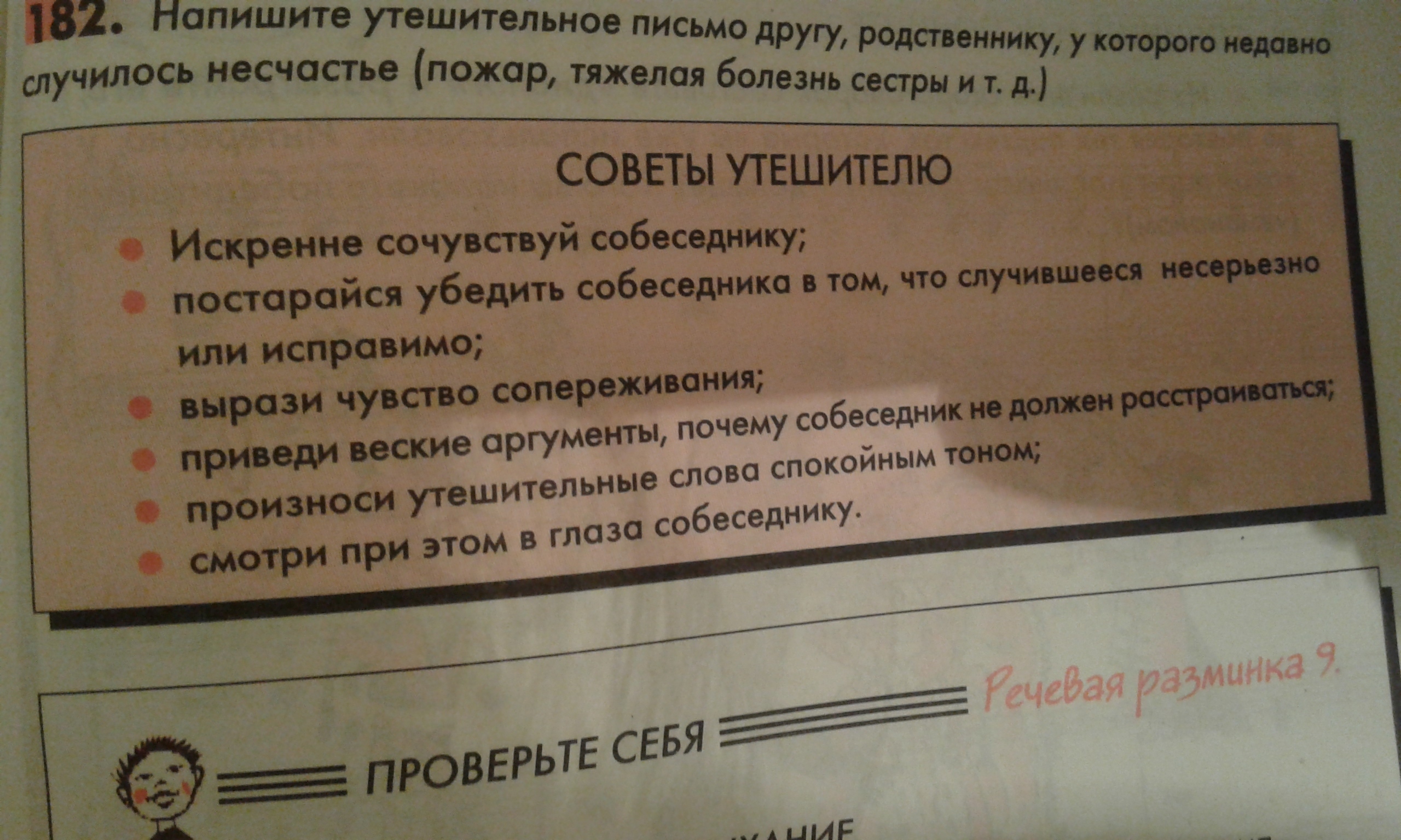 помоги п/ж 182 напишите утешительное письмо другу у которого недавно случилось несчастье ( пожар..тяжёлая болезнь сестры)