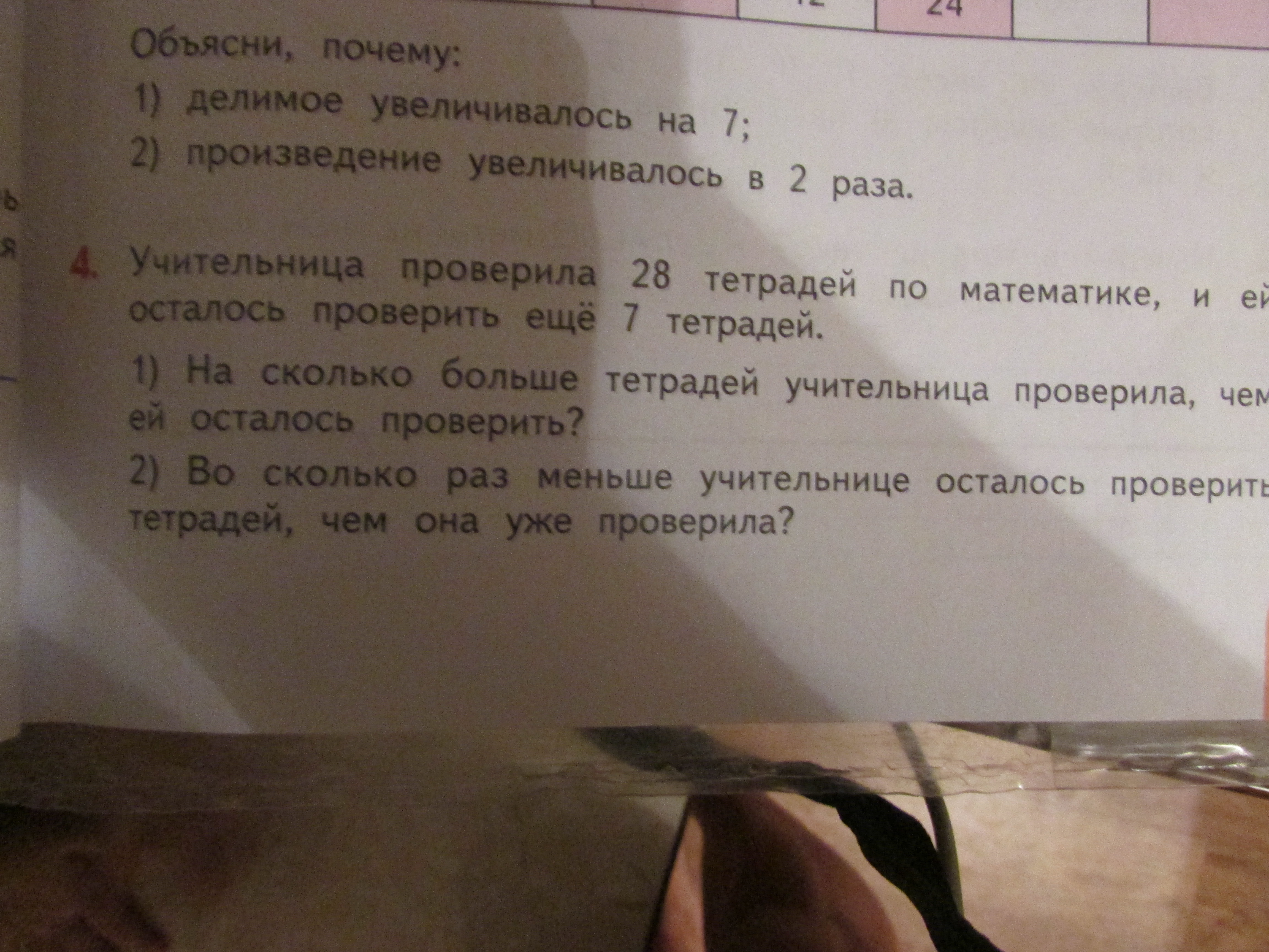 28:7=4 (р) - в 4 раза меньше учительнице осталось проверить