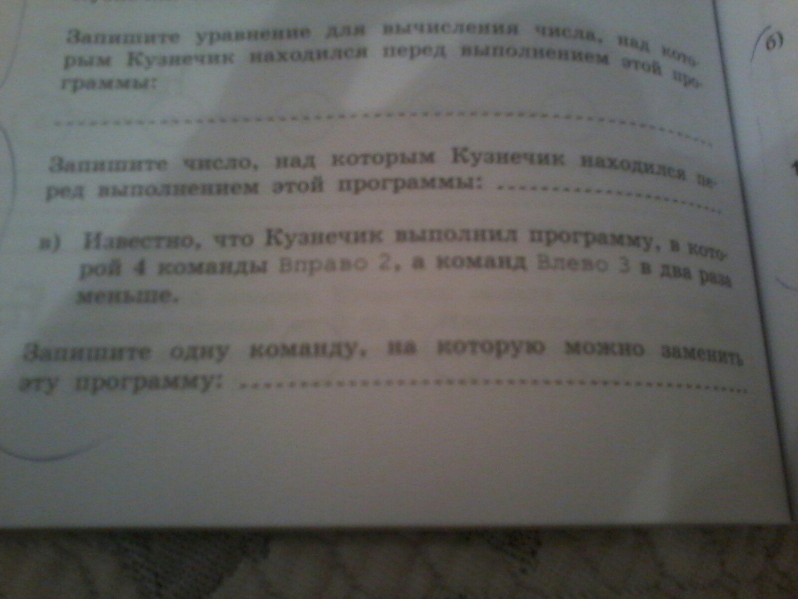 Команд "Вправо 2" четыре, значит команд "Влево 3" две. Кузнечик сходил на 2*4=8 клеток вправо и на 3*2=6 клеток влево. Все действия можно записать одной командой "Вправо (8-6=)2".
