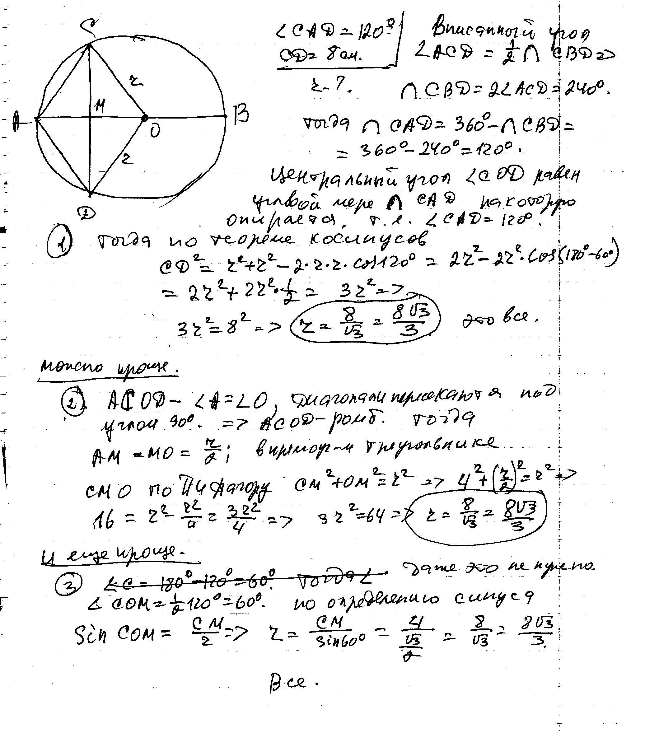 Диаметр АВ и хорда CD окружности пересекаются под прямым углом . Вычислить длину радиуса окружности если угол CAD=120градусов CD=8см
