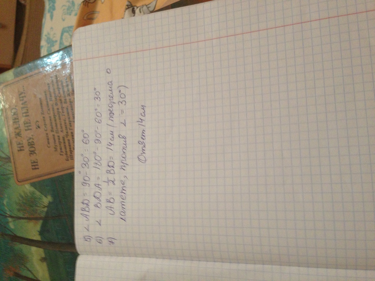 длина диагонали прямоугольника равна 28 см, а один из углов, образованных пр пересечении диагоналей, равен 120 градусов. найдите меньшую сторону прямоугольника