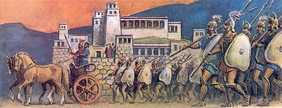 - в колесницу вместо коней запряжены захваченные в плен цари покоренных стран. Какому страшному унижению их подвергают! Но этим дело не ограничивалось. Бывало, что в губы и ноздри несчастных царей вставляли кольца и водили их на веревке по улицам., держали полуголыми и грязными в клетке у городских ворот. Ниневию вполне заслуженно называли городом крови. Здесь постоянно шествовали войска и гнали пленных. Было слышно, как хлопают кнуты и ржут кони. Грохочут колесницы. Говорили, что ни у кого нет стольких всадников как у царя Ассирии. Они не знают усталости, копыта их словно из камня… на рисунке справа виден царский дворец, он был возведен на искусственном холме и напоминал крепость. Вход во дворец, подобно грозным стражам охраняли огромные крылатые быки с человеческими головами. Посмотрите на верхний рисунок.