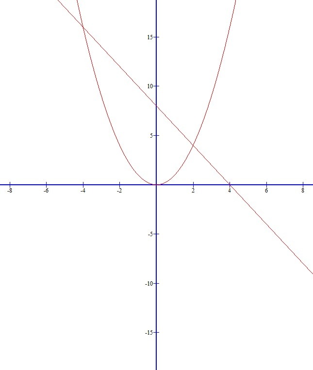 строим 2 графика: <икс квадрат> и <минус два икс плюс восемь>, находим абсциссу точек пересечения – это и будут корни уравнения. По графику: абсцисса равна –4 и 2. Так и пишем.