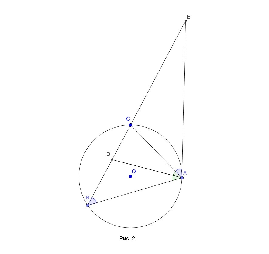 4. Без ограничения общности можно считать, что С лежит между B и Е. Тогда ∠B=∠CAE, т.к. ∠B - вписанный, а ∠CAE - угол между касательной и хордой в точку касания (см. рис 2). ∠EDA=∠B+∠BAD как внешний угол треугольника BAD. ∠EAD=∠CAE+∠CAD, но ∠BAD=∠CAD (AD - биссектриса). Значит ∠EDA=∠EAD, т.е. EAD - равнобедренный и AE=ED.