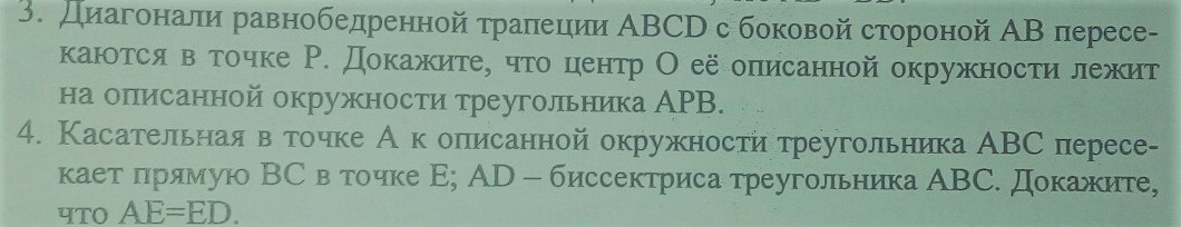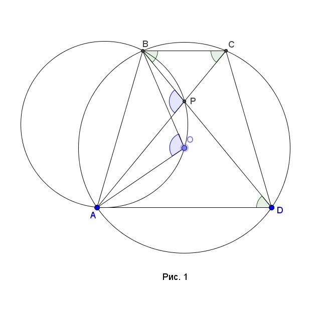 3. ∠BOA=2∠ADB т.к. ∠ADB - вписанный угол, а ∠AOB - центральный. ∠APB=∠PBC+∠PCB=2∠ADB, т.к. ∠APB - внешний угол треугольника PBC и ∠PBC=∠PCB=∠ADB в силу равнобедренности трапеции. Значит, ∠BOA=∠АPВ, т.е. ABPO - вписанный 4-угольник. (см. рис. 1).
