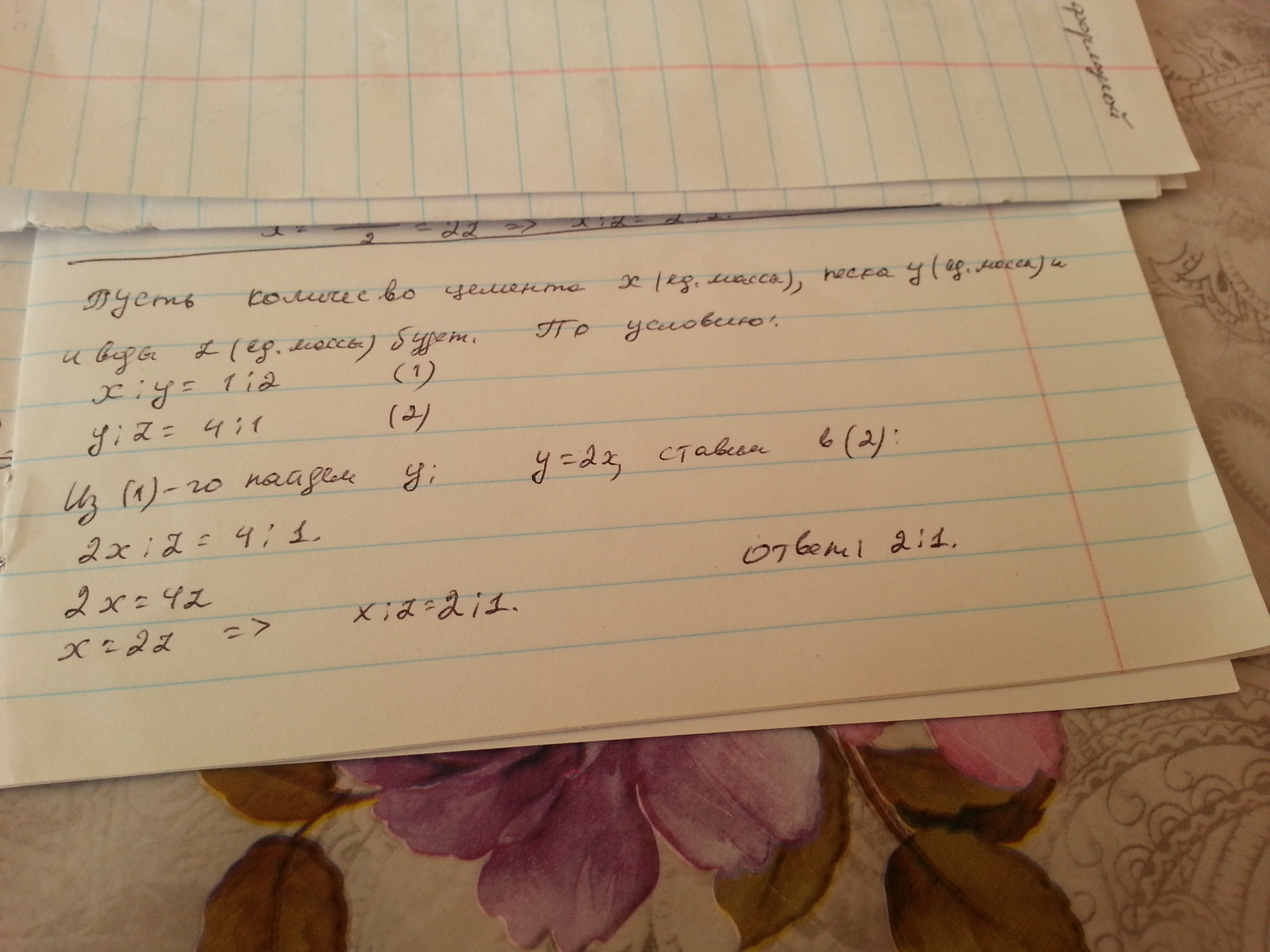для приготовления бетонной смеси взяли цемент,песок и воду.цемент и песок взяли в отношении 1:2,а песок и воду в отношении 4:1 в каком отношении находится цемент и вода задача