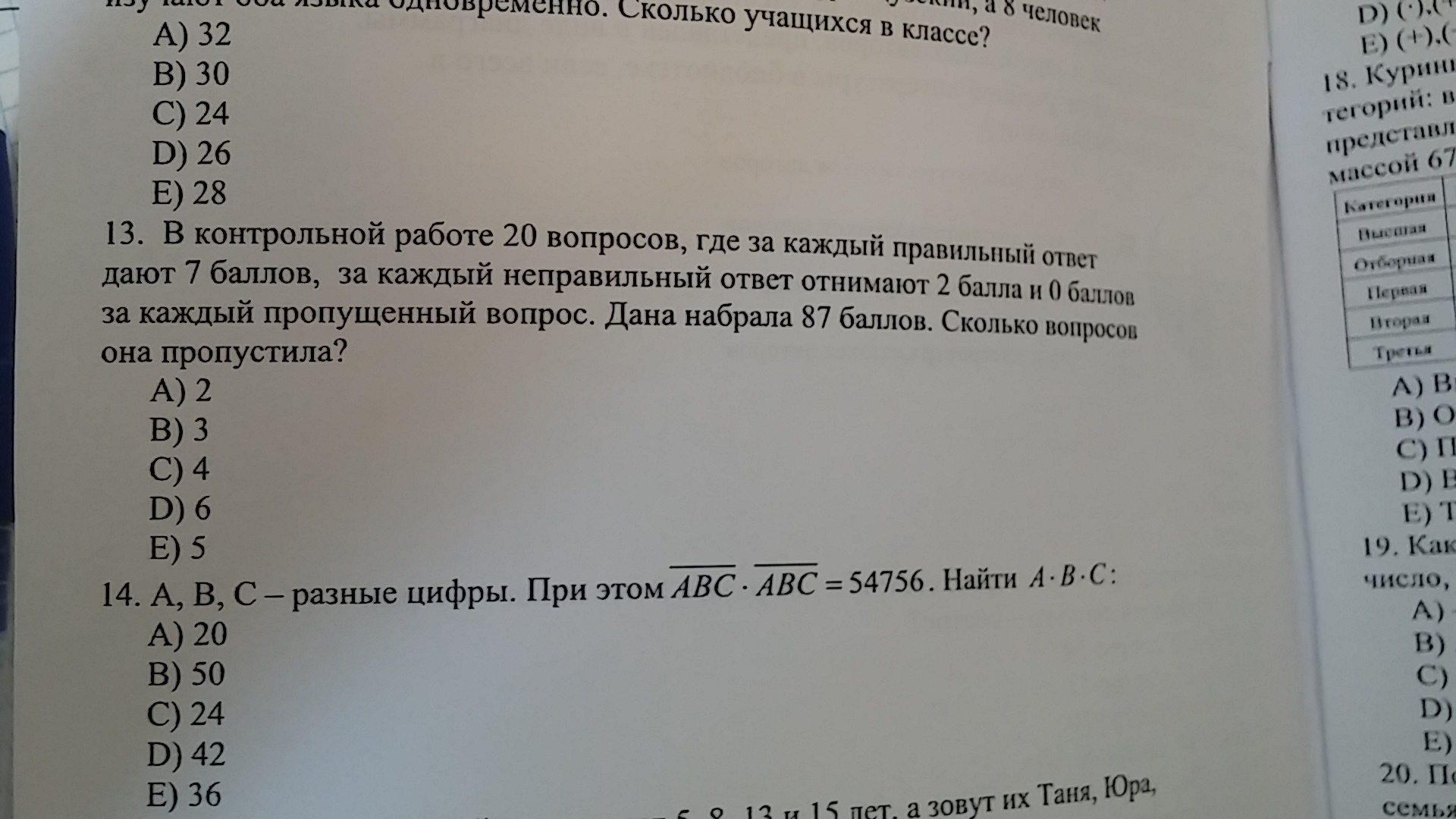 При этом 87:7 = 12 ц 1/7. То есть, для того, чтобы набрать 87 баллов, она должна была ответить верно не менее, чем на 13 вопросов.