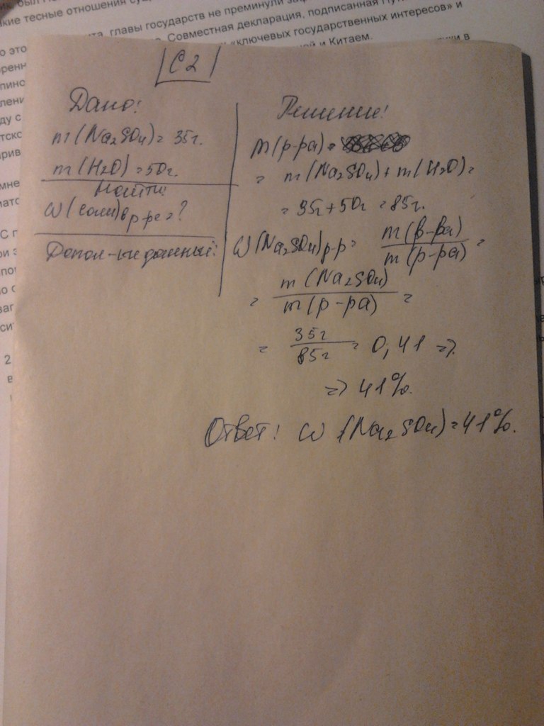 С2. 35 г сульфата натрия растворили в 50 г воды. Вычислите массовую долю (%) соли в полученном растворе.