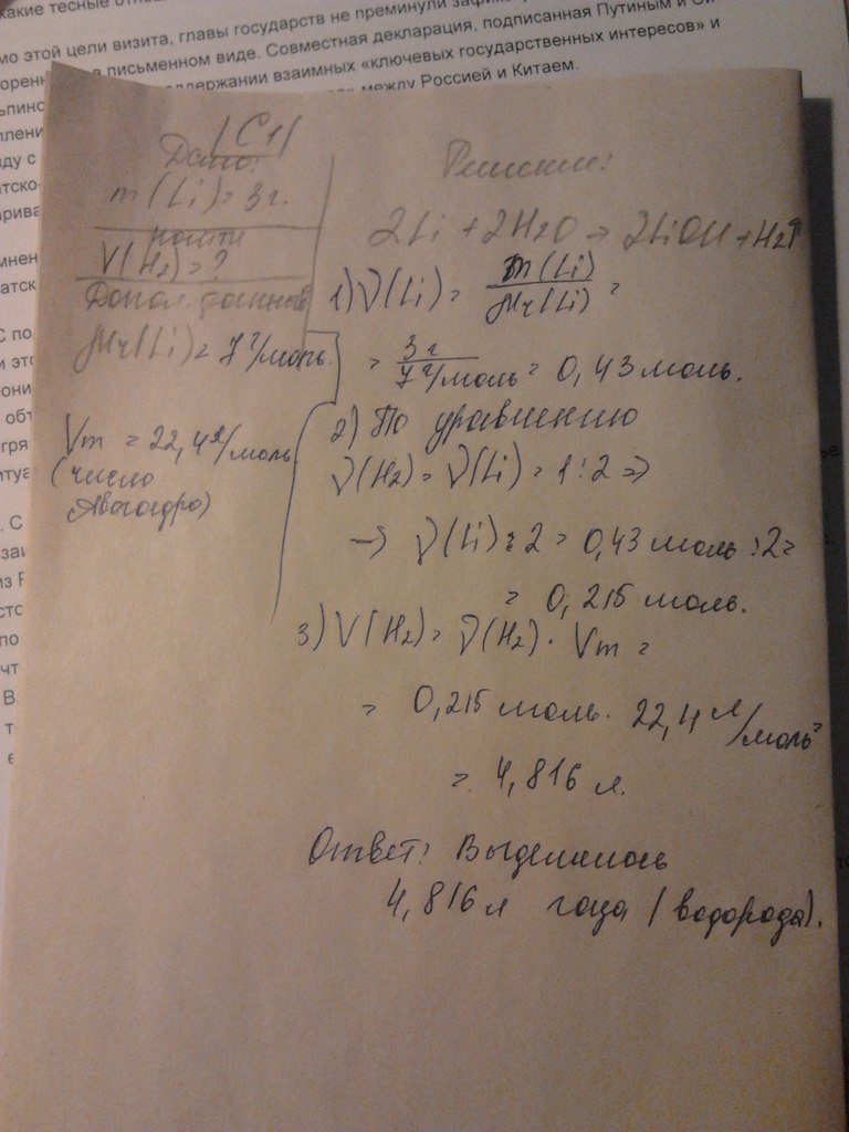 С1. 3 г лития растворили в избытке воды. Вычислите объём газа(л), выделившегося в результате реакции при н.у.