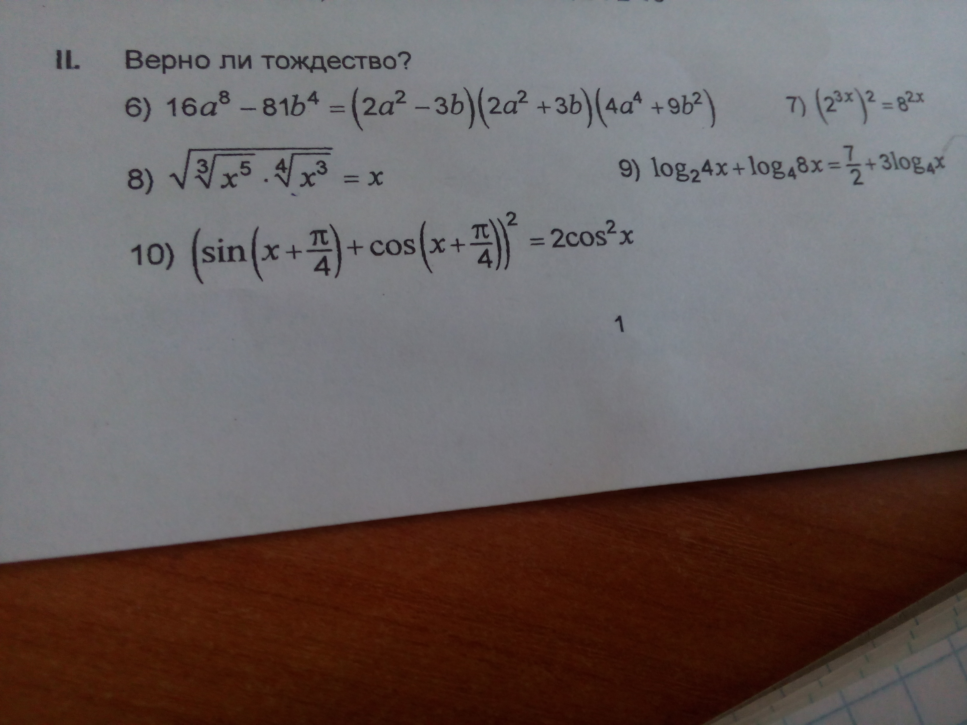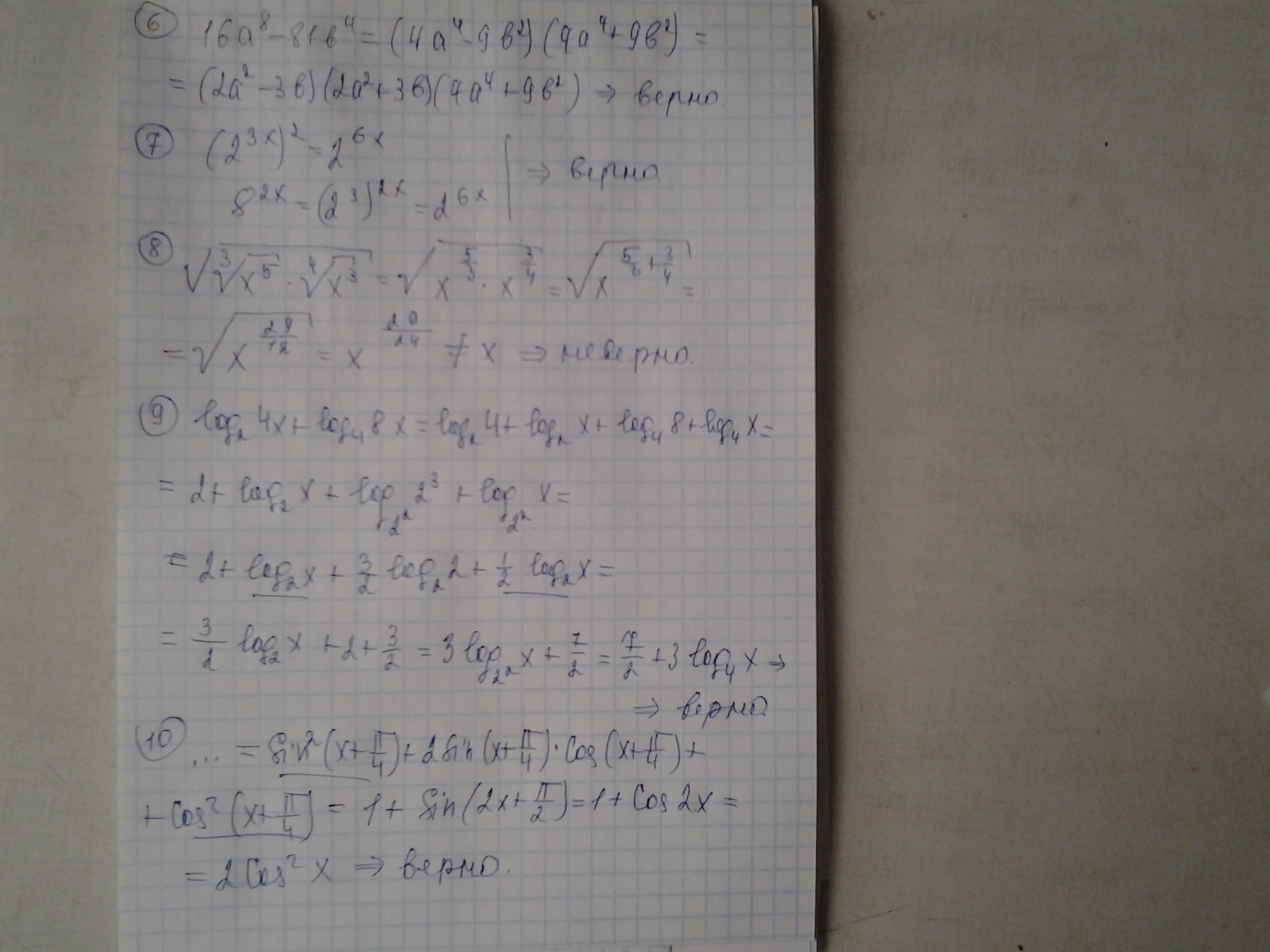Применены : свойства логарифмов и степени, формула разности квадратов, формула квадрата суммы, основное тригонометрическое тождество, формула приведения, формула двойного угла косинуса
