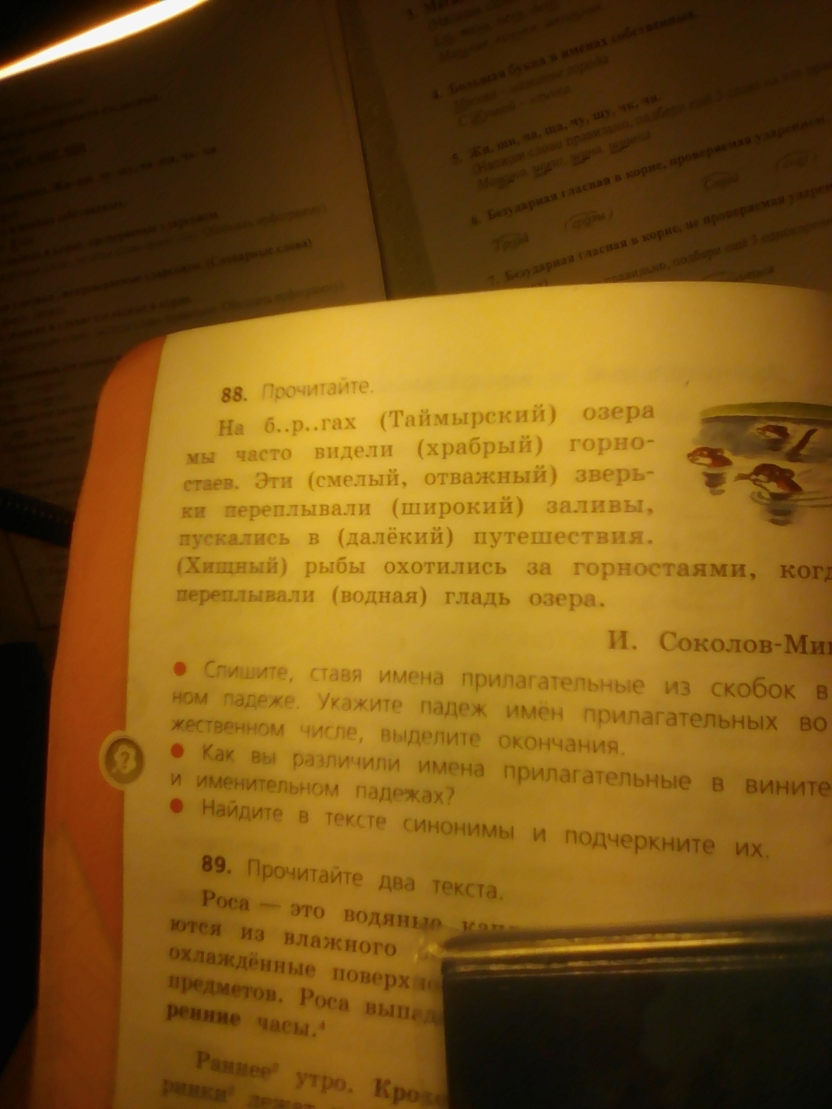 На берегах Таймырского озера мы часто видели храбрых горностаев.Эти смелые,отважные зверьки переплывали широкие заливы,пускались в далёкие путешествия.Хищные рыбы охотились за горностаями,переплывали водную гладь.
