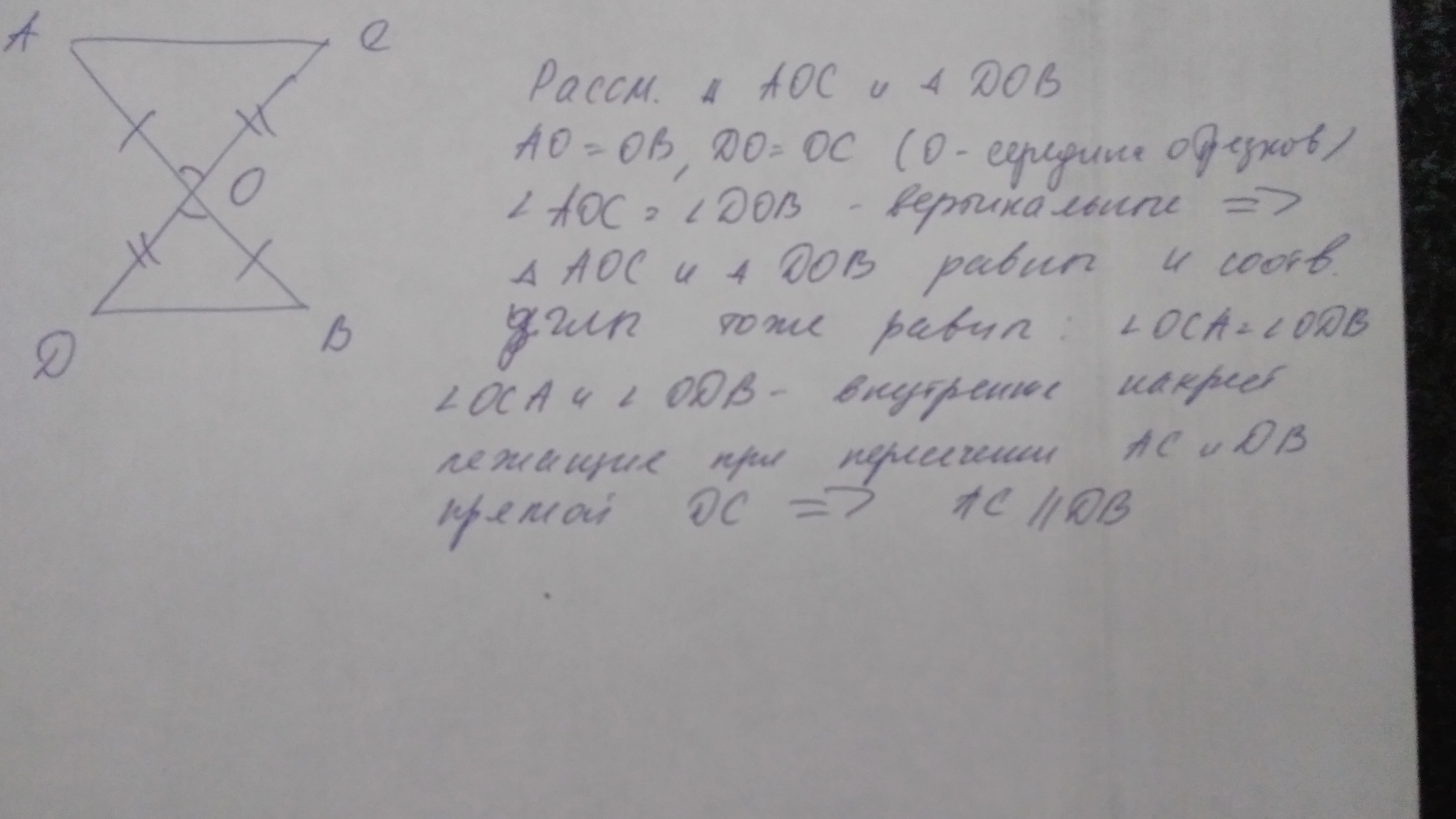 Отрезки AB и CD пересекаются в их середине в точке O. Докажите, что CA || BD