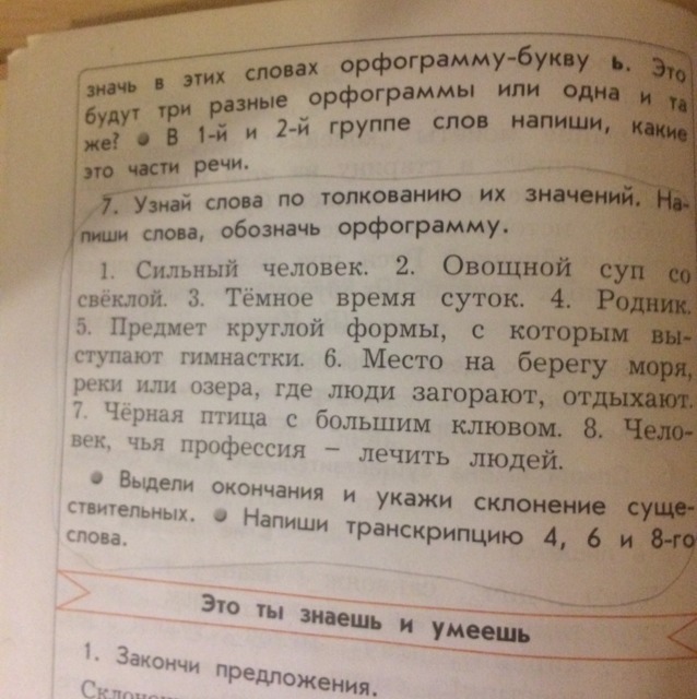 Силач, борщ(щи), ночь, источник, мяч, берег, ворона(сорока), доктор.