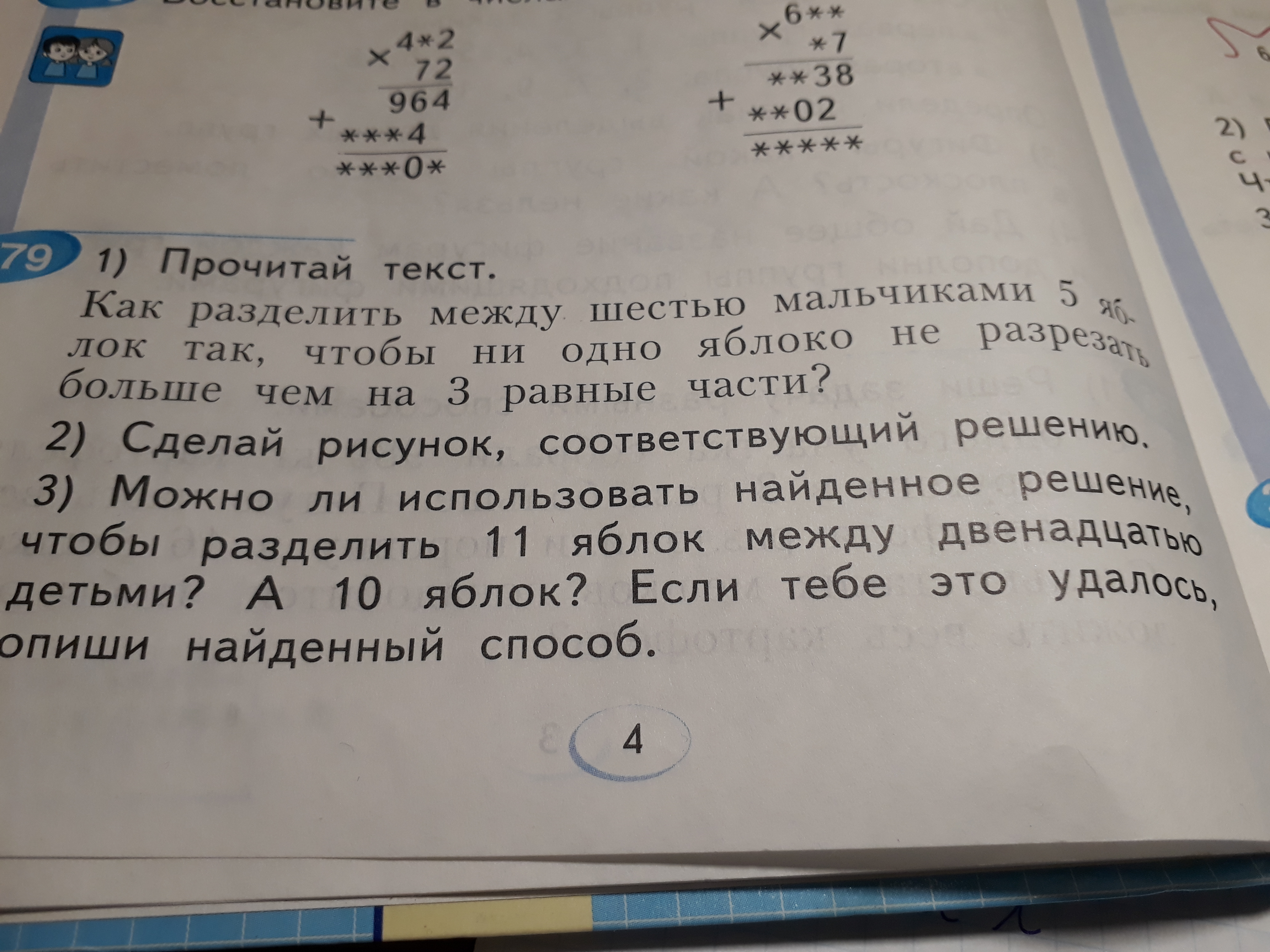 Два яблока режутся на 3 части, а остальные три яблока на 2 части. каждый ребенок берет треть яблока и его половинку:12+13=56