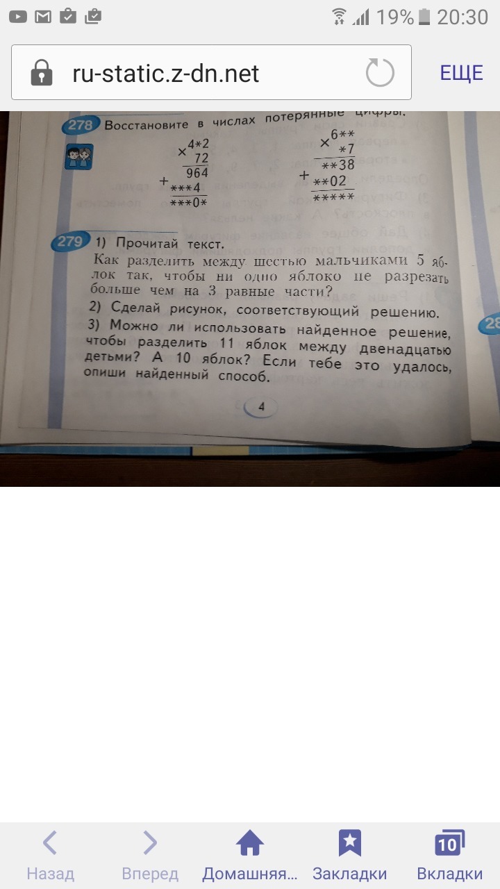 незнаю правельно или нет но ....….. каждые 5 яблок нужно разделить пополам и всем по половине яблока 4 лишних