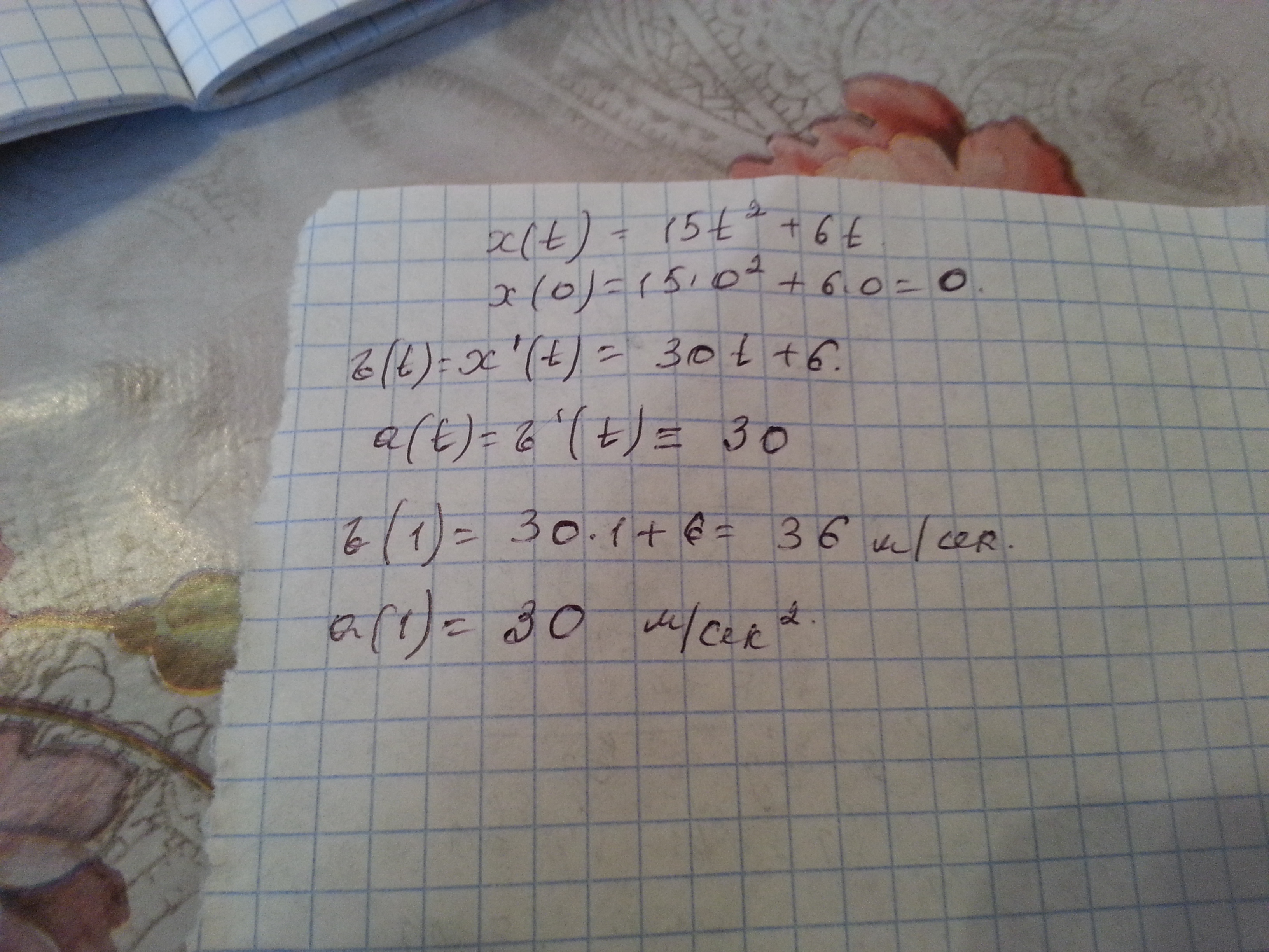 точка движется по закону x (t)=15t^2+6t. Найдите формулу вычисления скорости в любой момент времени. Вычислите скорость и ускорение при t=1 (время измеряется в секундах, координата - в метрах)
