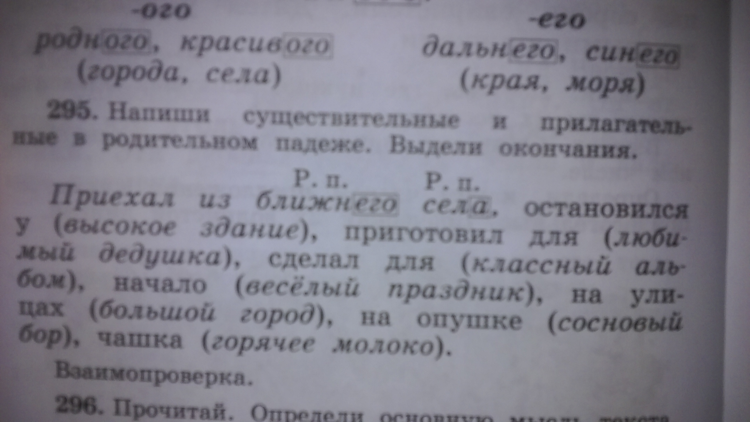 Высок[ого] здани[я], любим[ого] дедушк[и], классн[ого] альбом[а], весёл[ого] праздник[а], больш[ого] город[а], соснов[ого] бор[а], горяч[его] молок[а].
