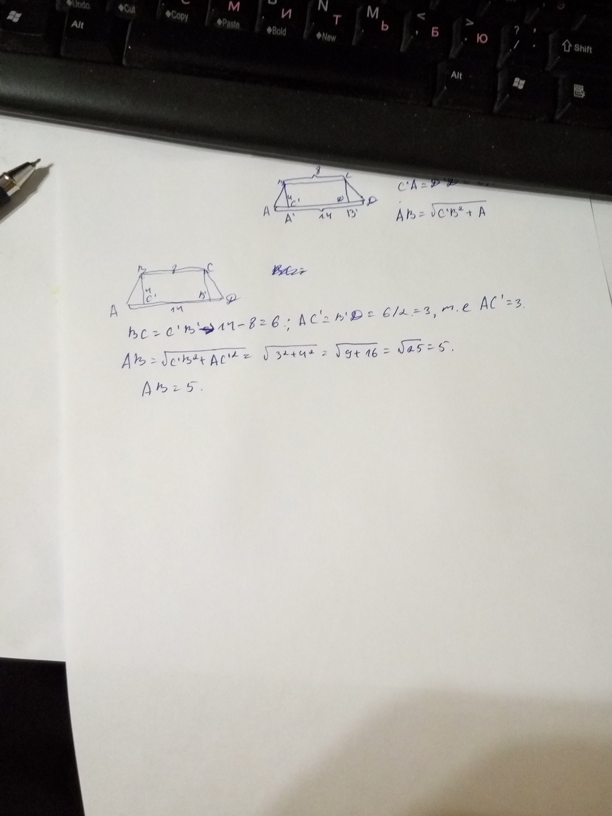 в равнобедренной трапеции основания равны 8см и 14,а высота трапеции 4см, найти боковую сторону трапеции