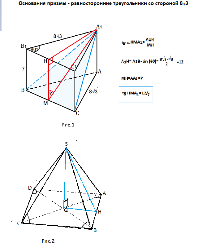 1. В правильной треугольной призме ABCA1B1C1 ребро основания AB= 8 корней из трех, а ребро AA1=7. Найдите: а) Площадь повернхности пирамиды
