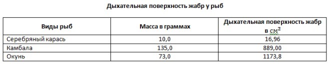 Пользуясь таблицей «Дыхательная поверхность жабр у рыб» и знаниями курса биологии ответьте, на следующие вопросы: