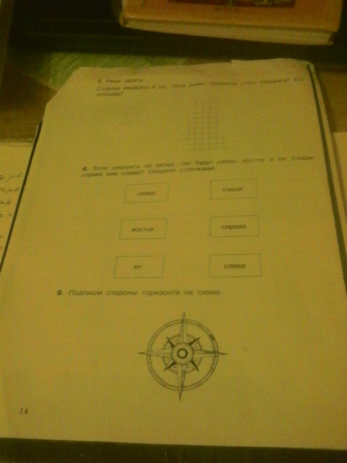 8: Если смотреть на запад, где будут север, восток и юг (сзади, справа или слева)? Соедини стрелками.: