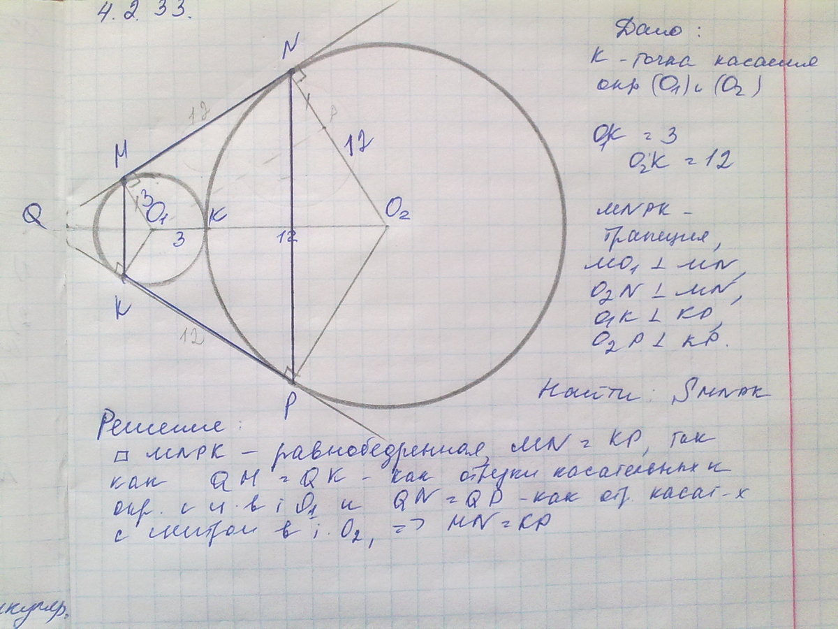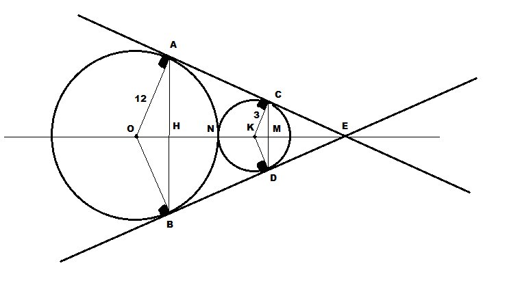 Две окружности радиусов 3 и 12 касаются внешним образом в точке. Найдите площадь трапеции, ограниченной двумя общими касательными к этим окружностям и прямыми, соединяющими точки касания.