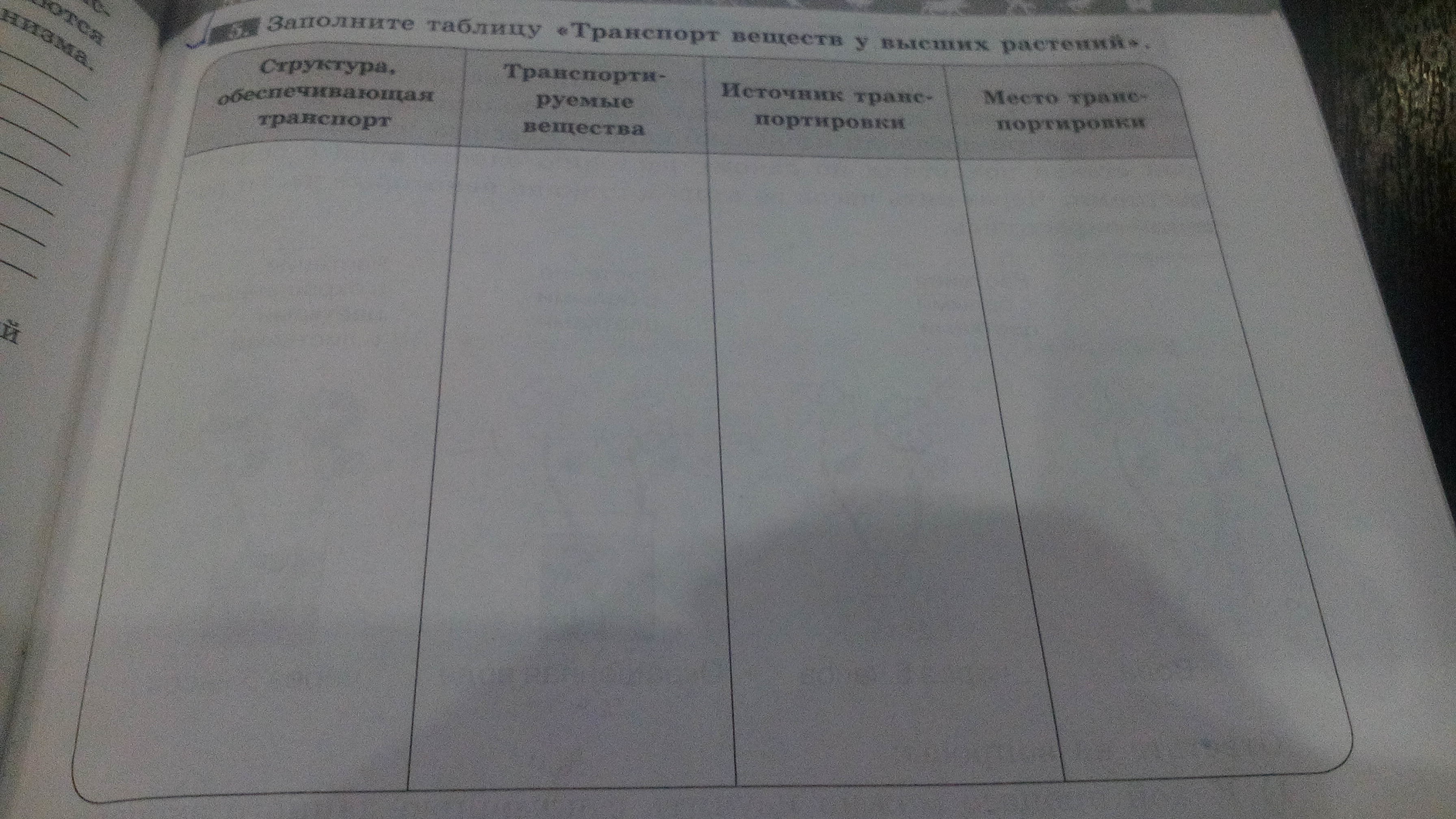 Заполни таблицу.Транспорт веществ у высших растений.
