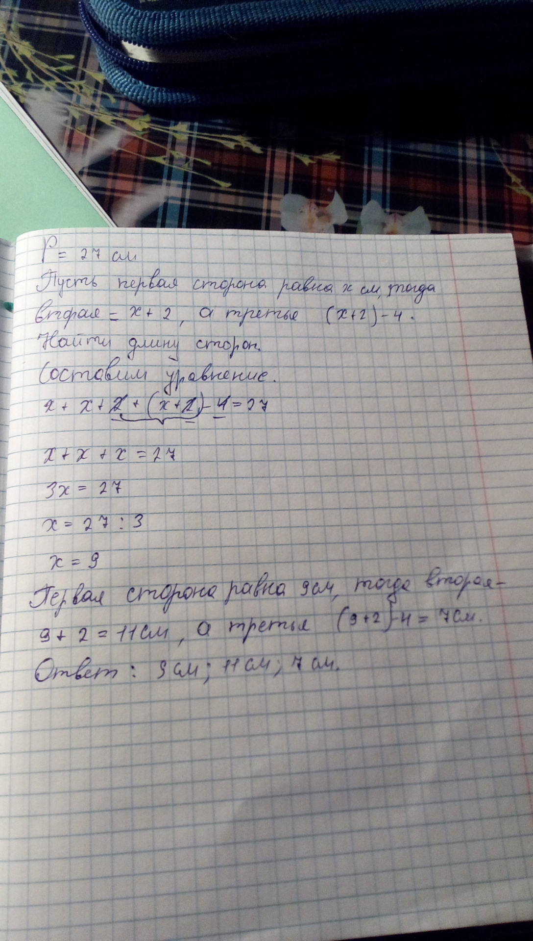 Периметр треугольника 27 см Чему равна длина сторон треугольника если вторая его сторона на 2см длиннее первой а третья сторона на 4 см короче второй ? (Сделайте пожалуйста с наименование )