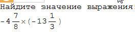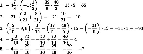 1.;-4frac78cdotleft(-13frac13right)=frac{39}8cdotfrac{40}3=13cdot5=65\2.;-21cdotleft(frac2{21}+frac8{21}right)=-21cdotfrac{10}{21}=-10\3.;left(3frac25-9,6right):frac1{15}=left(frac{17}5-frac{48}5right)cdot15=left(-frac{31}5right)cdot15=-31cdot3=-93\4.;-3frac3{10}+frac{73}{10}=-frac{33}{10}+frac{73}{10}=frac{40}{10}=4\5.;-4frac1{10}-frac{29}{10}=-frac{41}{10}-frac{29}{10}=-frac{70}{10}=-7