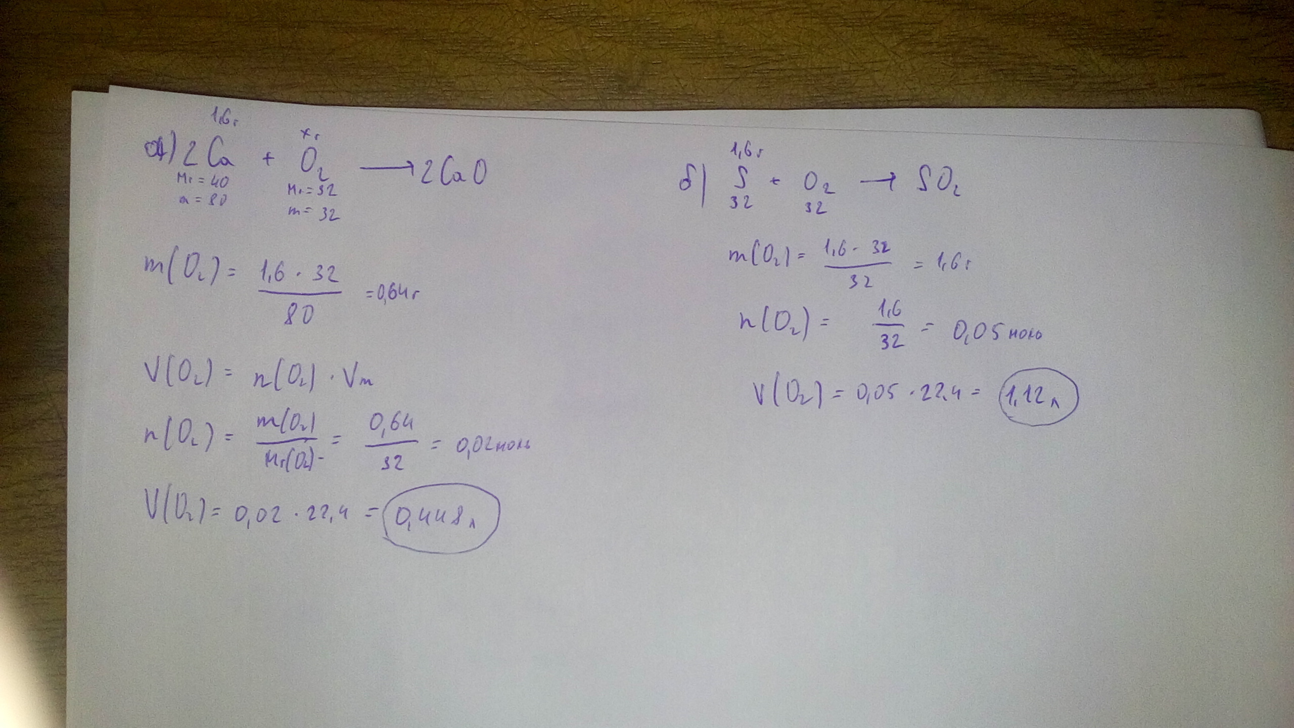 Напишите уравнения реакций горения: а)кальция б)серы. Расчитайте объём кислорода (л, н.у.), если масса сгоревшего вещества равна 1,6 г.
