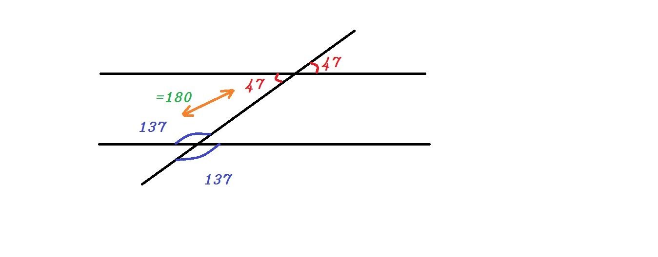 Угол 133 и 47 являются внутренними односторонними углами ( оранж. стрелочкой показал ), и если они образуют в сумме 180 градусов, то прямые параллельны.