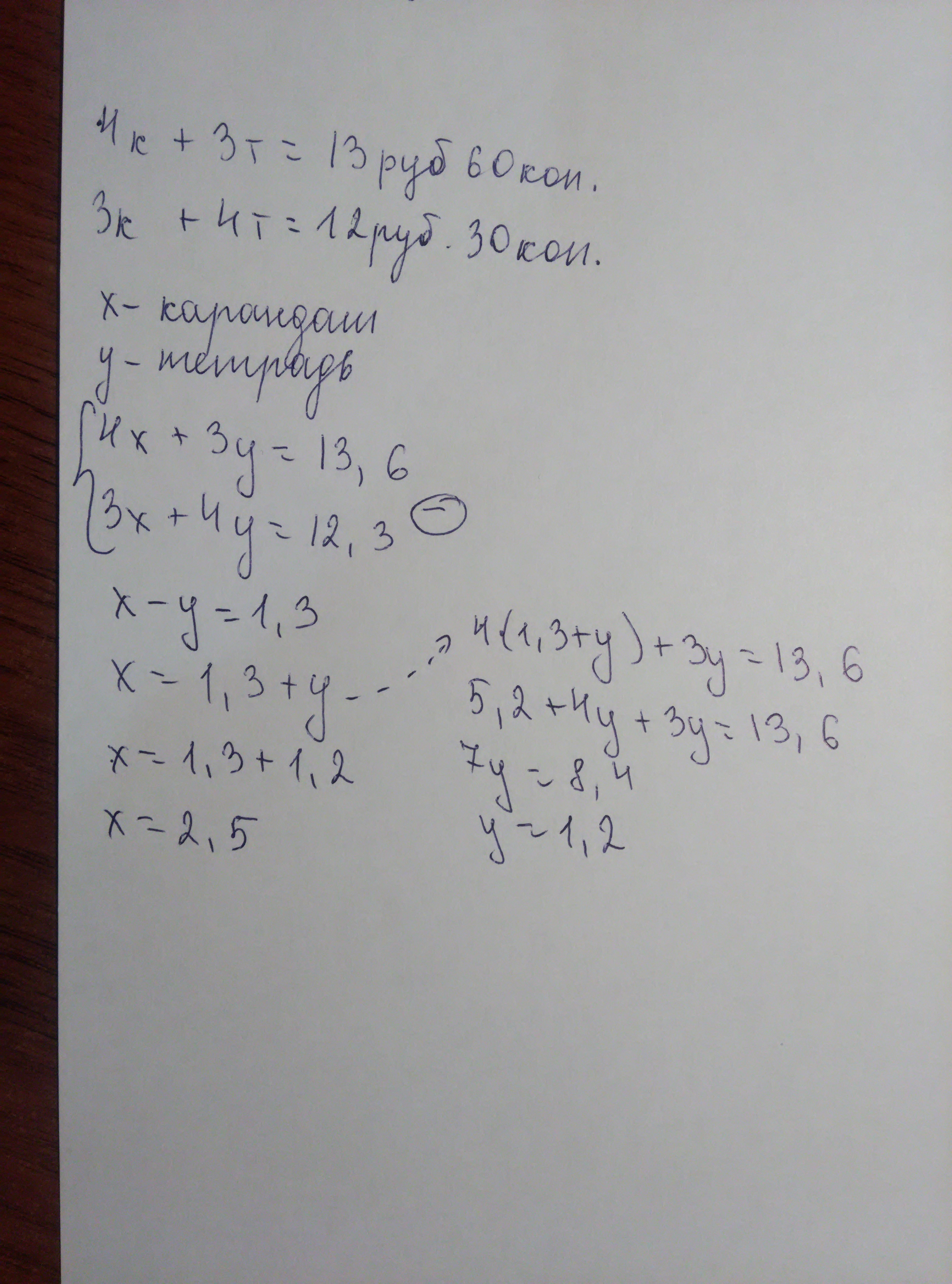 четыре карандаша и три тетради стоят 13руб.60коп, а три карандаша и четыре тетради 12руб.30коп. Сколько стоит один карандаш, сколько стоит одна тетрадь? Пожалуйста помогите! Мне срочно надо! Я очень долго думала над этой задачей, но ничего не получалось! Помогите!