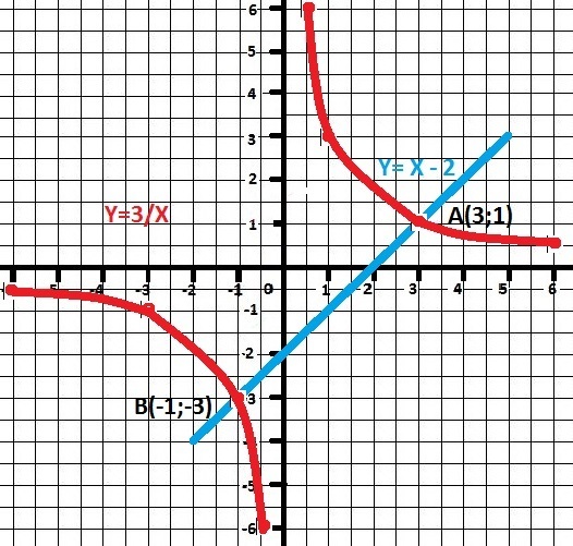 2. Графическое решение в приложении. Два корня - А(3;1) и В(-1;-3)