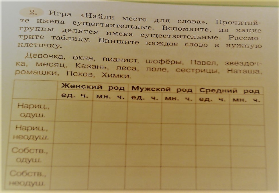 нариц. неодуш. ж.р. ед.ч. звездочка, ж.р.мн.ч. ромашки, м.р. ед.ч. месяц, м.р.мн.ч. леса, ср.р. ед.ч. поле, ср.р. мн.ч. окна