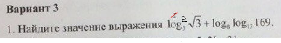 log²3 √3 + log8log13 169 = log²3 3^1/2 + log2³log13 13² = (1/2)²+ 1/3*log2 2= 1/4+ 1/3= 3/12+4/12=7/12