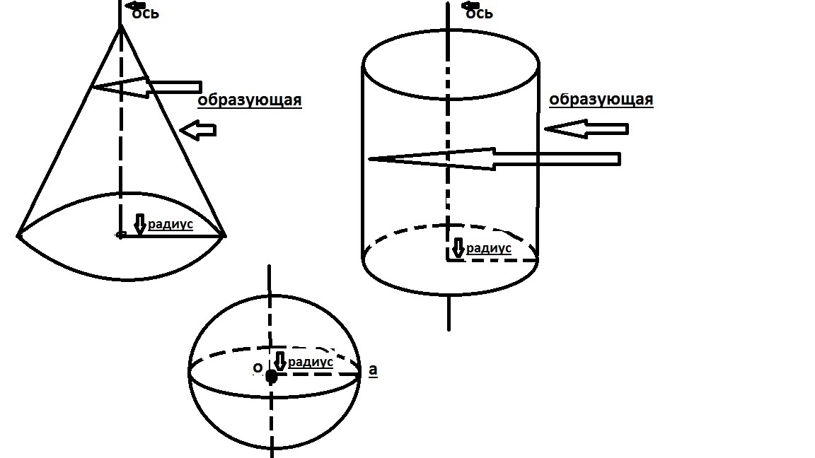 Перечертите в тетрадь рисунки ниже и дорисуйте изображение конуса, цилиндра и шара. Обозначьте на рисунке ось, образующую и радиус нижнего основания цилиндра. Обозначьте на рисунке ось, образующую и радиус основания конуса. Обозначьте на рисунке радиус ОА шара.