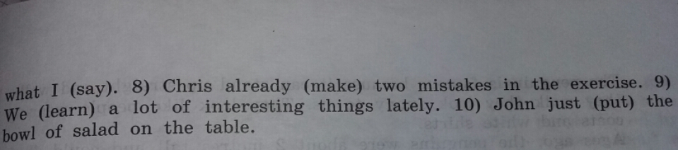 8) Крис уже (сделать) две ошибки в упражнении.9)мы (учиться) много интересного в последнее время. 10) Gohn порыв ( положить) тарелку с салатом на стол.