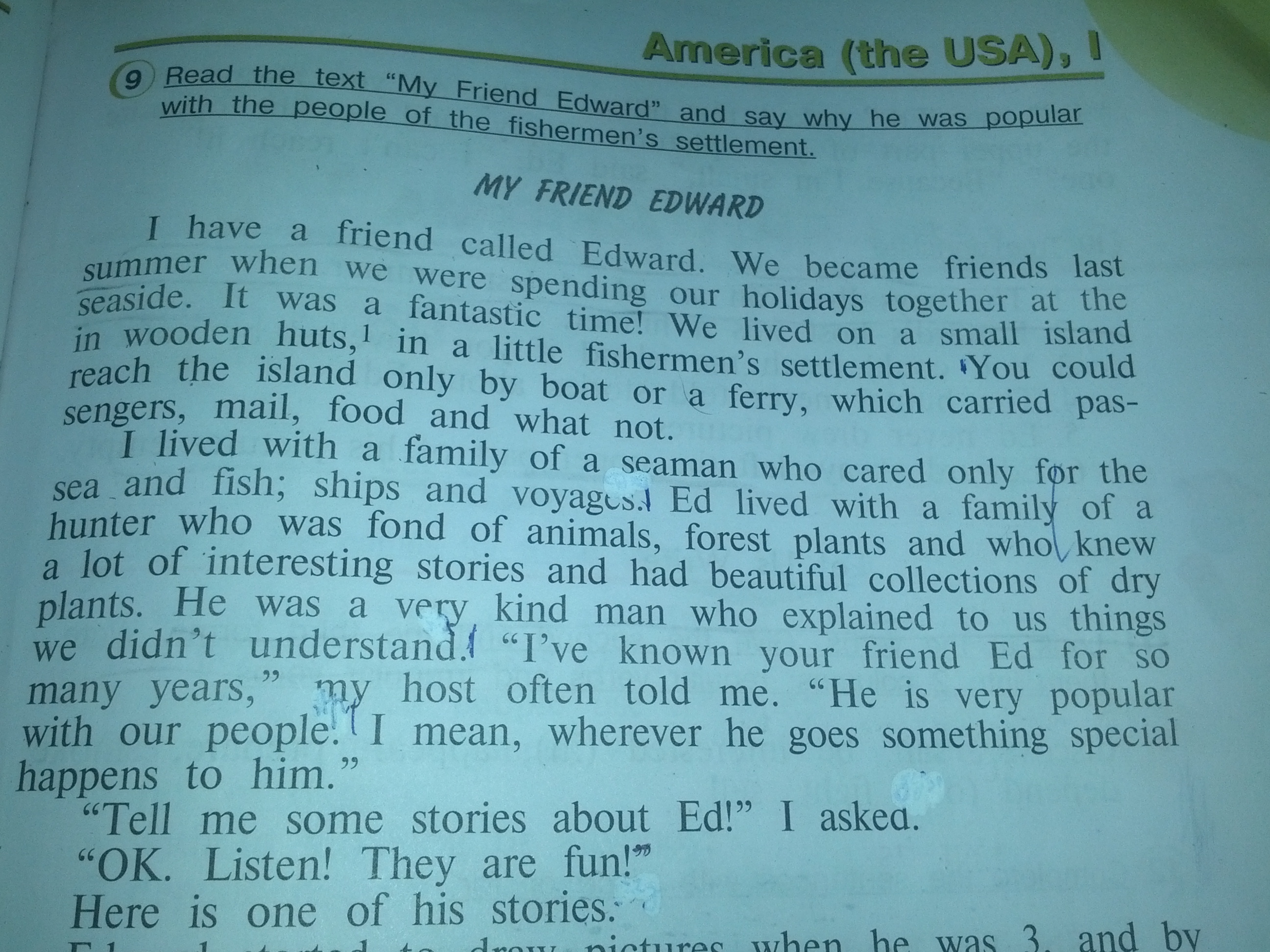 У меня есть друг по имени Эдвард. Он стал моим другом прошлым леток когда мы были вместе на каникулах на море. Это было замечательное время! Мы жили на маленьком острове в маленьком доме рыбака.