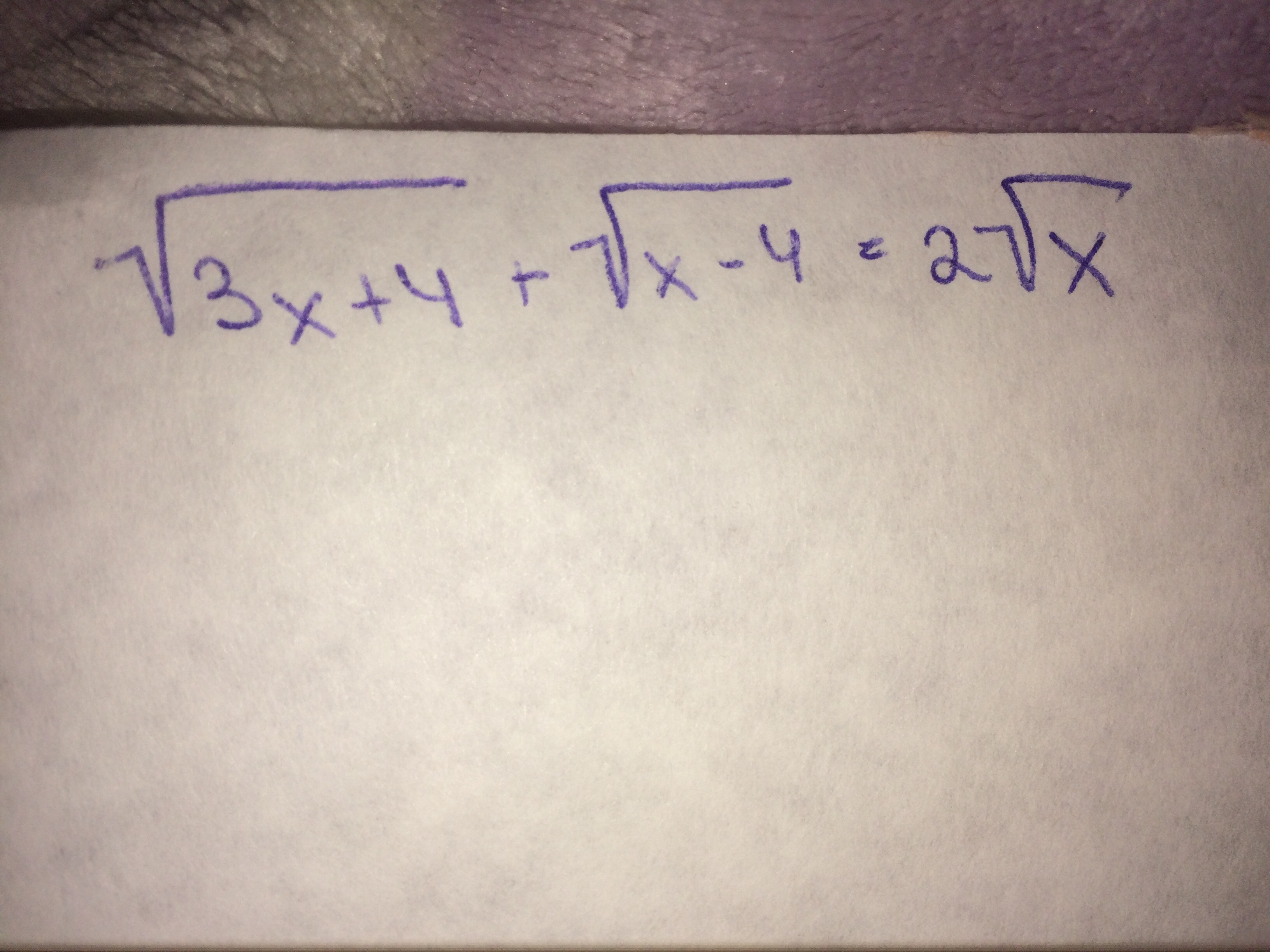 sqrt{3x+4}+ sqrt{x-4} =2 sqrt{x}