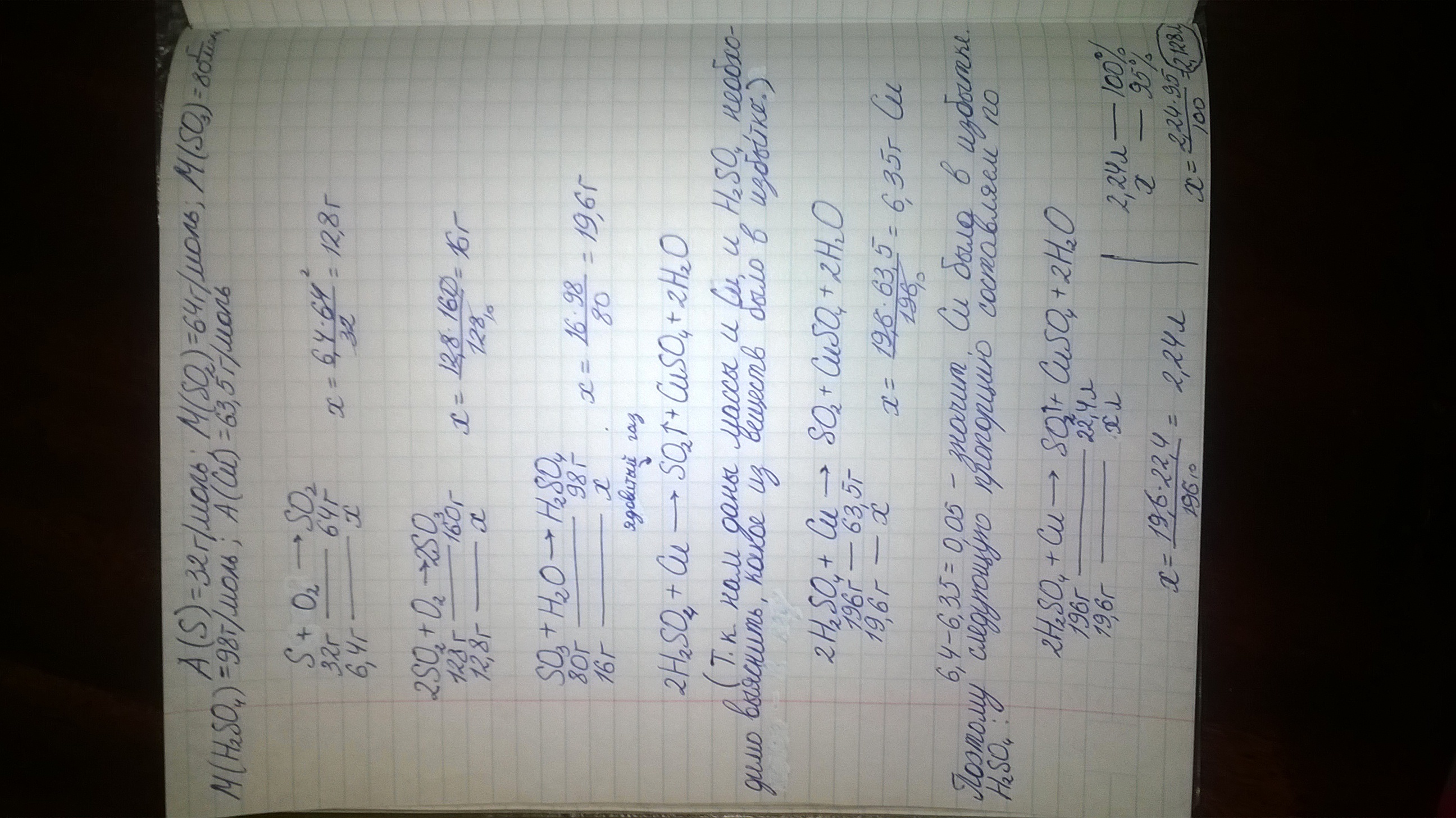6,4 грамма серы сожгли в избытке кислорода, полученный газ окислили кислородом на катализаторе ( V2O5) оставшееся вещество растворили в воде, в полученном веществе растворили кусочек меди массой 0,64 грамма. Найти объем ядовитого газа, если практический выход продукта реакции = 95%